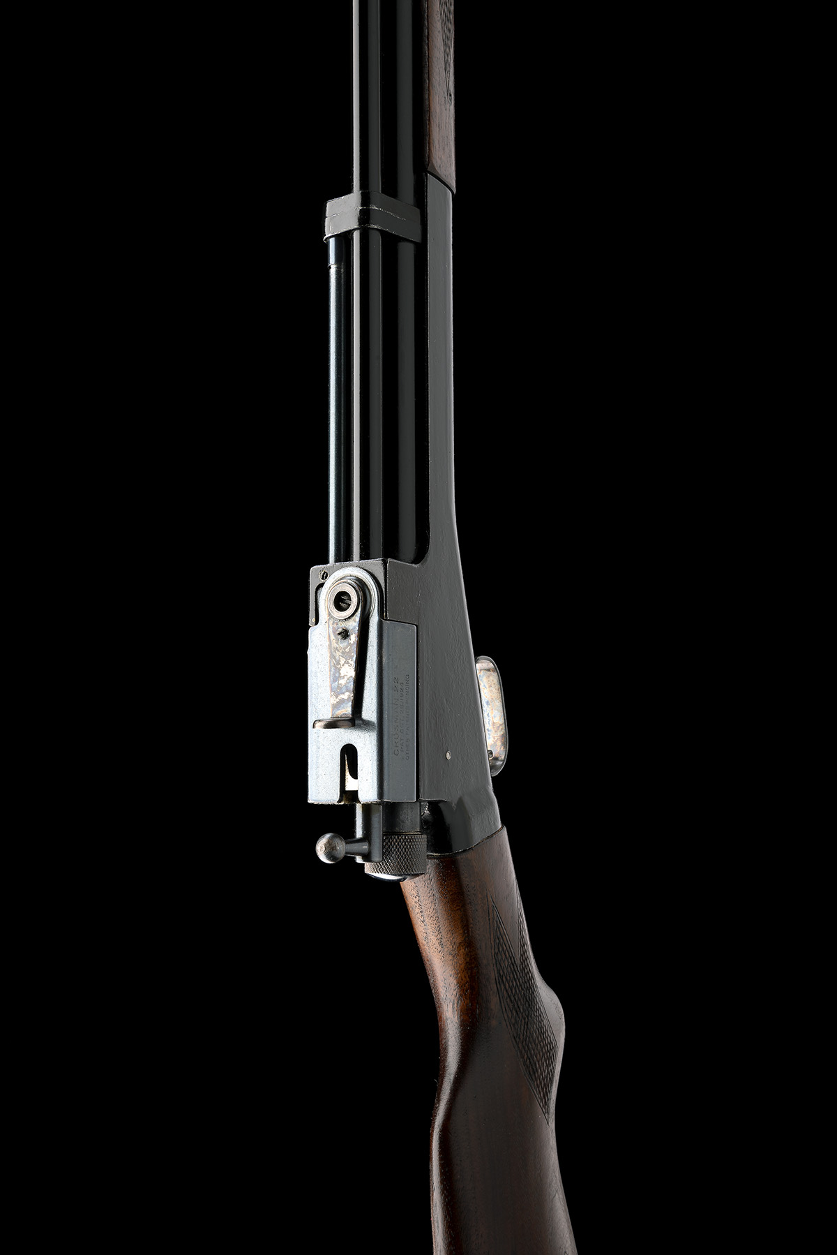 circa 1935, with black painted 20in. barrel, bolt action blued breech marked 'MFD BY CROSMAN ARMS CO. ROCHESTER N.Y. on the left side and 'CROSMAN .22 PAT. OCT. 28 1924, OTHER PATENTS PENDING' and fitted with ten-shot tube magazine, black painted alloy receiver, knurled cocking piece to rear, peep-sight to top of breech, wood semi pistol-grip butt-stock with colour-hardened heel-plate, chequered wood fore-arm, the whole retaining the majority of its factory finish and generally in collector's external condition
