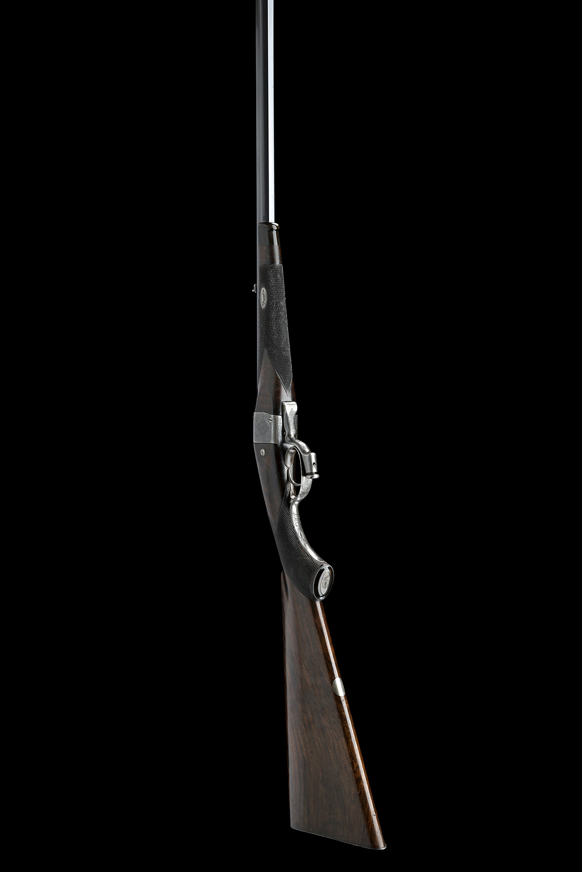 a second quality model manufactured in 1873 with 25in. octagonal barrel engraved 'ALEXR. HENRY. 12 SOUTH ST. ANDREW'S ST. EDINBURGH. PATENT NO. 2104', dove-tailed standing notch rear-sight with two additional folding leaves equipped with white metal sight lines and marked for 100,150 and 200 yds, bead fore-sight, barrel with Henry patent rifling, use number 137, standing breech with an oval marked 'PATENT NO. 815', left hand bolted back-action lock with high-spurred dolphin hammer, top strap drilled and tapped for a peep-sight (absent), fine border and acanthus scroll engraving retaining slight traces of original colour-hardening, well-figured pistolgrip stock with horn pistolgrip-cap and chequered steel buttplate, fore-end with crosspin release and horn finial, in its full length oak case with numerous accessories and South Andrew Street address trade label