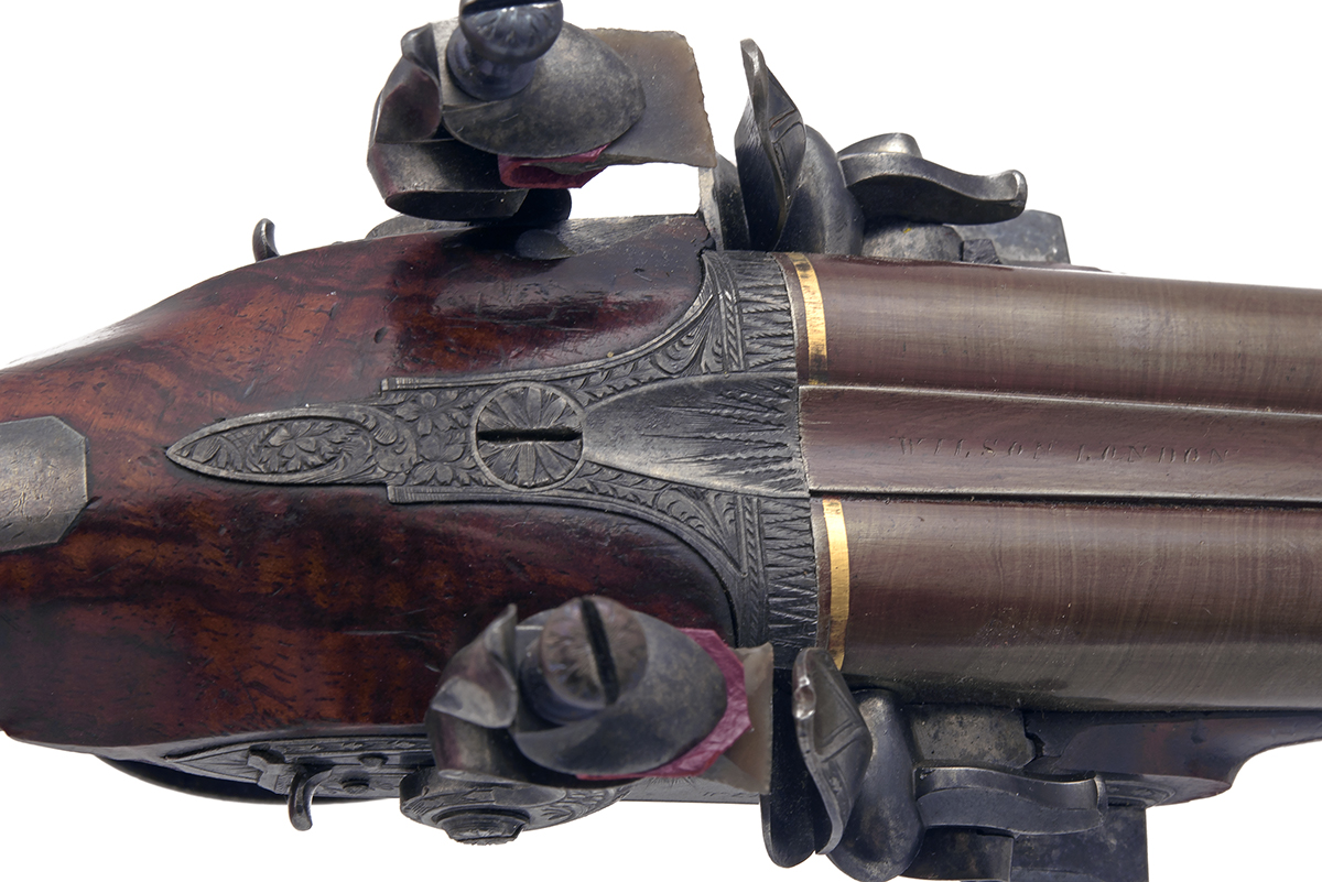 circa 1810, with expertly rebrowned 4 3/8in. side by side barrels, the top-rib signed 'WILSON, LONDON', small applied crescent fore-sight, gold bands at breech, platinum lined touch-holes, fully engraved top-tang with shallow sighting groove, border engraved bevel-edged locks signed 'WILSON' below the semi rainproof pans, sliding safes behind the engraved swan-necked cocks and rollers to the frizzen-springs, walnut three-quarter stock with chequered bag-shaped butt, engraved and blued trigger guard bow and horn-tipped ramrod, strong amount of original finish to iron furniture