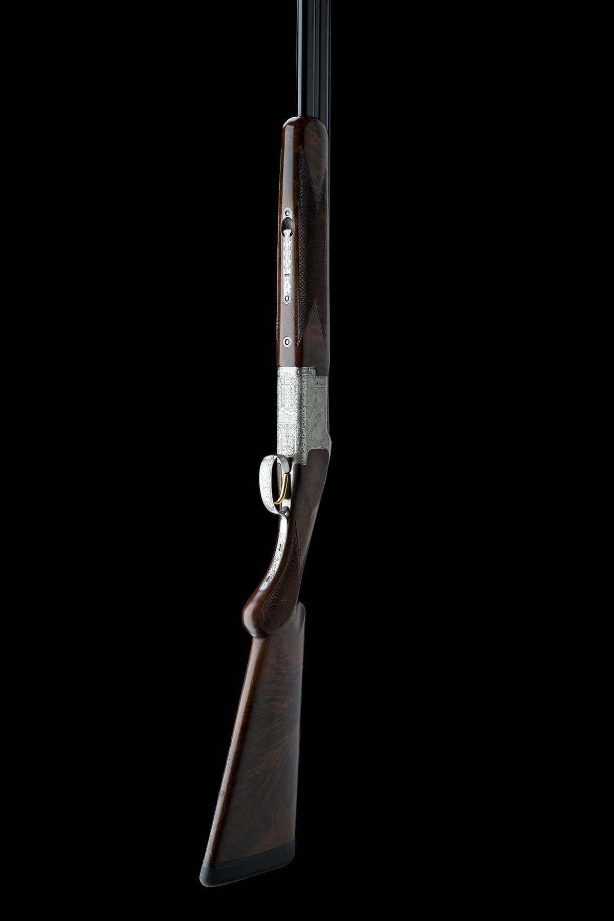 for 1989, 28in. nitro reproved barrels with 6mm ventilated matt top-rib, 2 3/4in. chambers, multichokes (no spares), hold-open toplever, manual safety with integral barrel selector switch, gold-washed trigger, bold acanthus scroll engraving with game scenes of duck and pheasant, bright finish, 14 3/8in. semi-pistolgrip stock including 1in. rubber recoil pad, weight 6lb. 12oz.