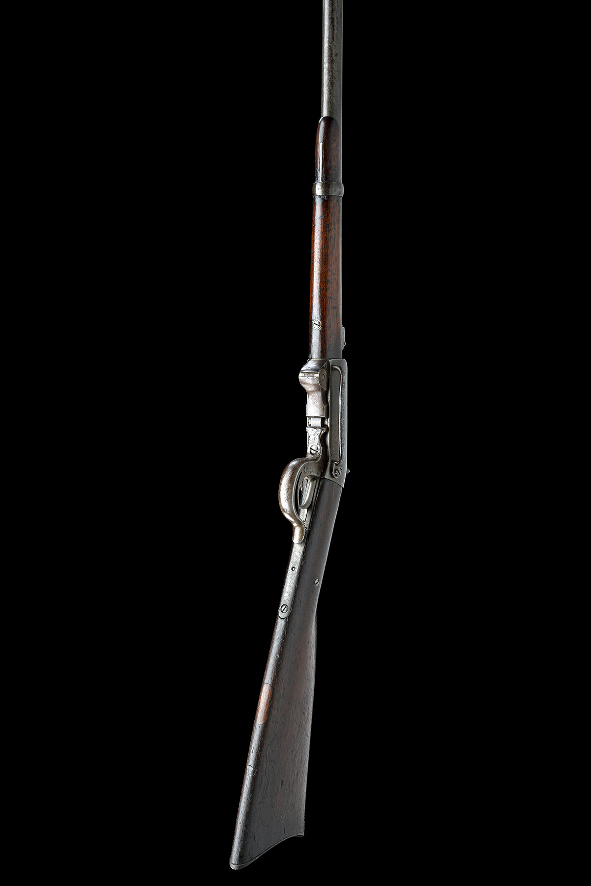 with 21in. barrel fitted with pinched blade front-sight, and leaf battle rear-sights to 500 yards, the breech top stamped 'BURNSIDE PATENT / MODEL OF 1864', (faint), interestingly although marked "Model of 1864" deliveries started in 1863 and this is one of the early deliveries from that year, breech block and action stamped with the serial number 6954, and for the convenience of the trooper a side-rib is fitted to the left-side of the action, back-action lock stamped in small letters 'BURNSIDE RIFLE CO. / PROVIDENCE R.I.', (faint), two piece iron mounted walnut stock, the splinter fore-end with one spring retained band, the butt with crescent butt-plate