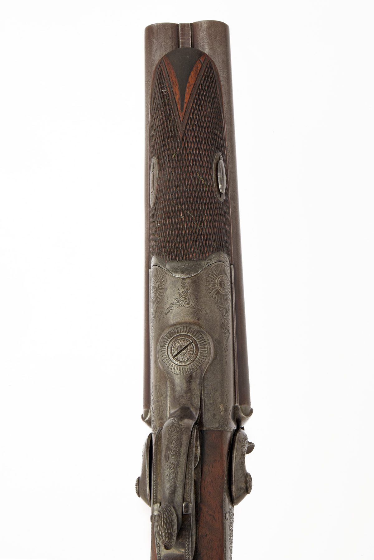 circa 1870, with browned damascus 6 5/16in. barrels, matted top-rib with rectangular panel signed ' THO'S HORSLEY, YORK', border engraved breech-end and pin apertures, engraved colour hardened rounded action body with 'Jones' type swing under-lever, shallow percussion fences, border and scroll engraved curved back-action locks signed 'THO'S HORSLEY', scroll engraved hammers, long engraved top-tang, chequered walnut grip, moulded and engraved iron butt-cap with central trap-door and chequered walnut splinter fore-end, strong traces of original colour and a good amount of finish remaining