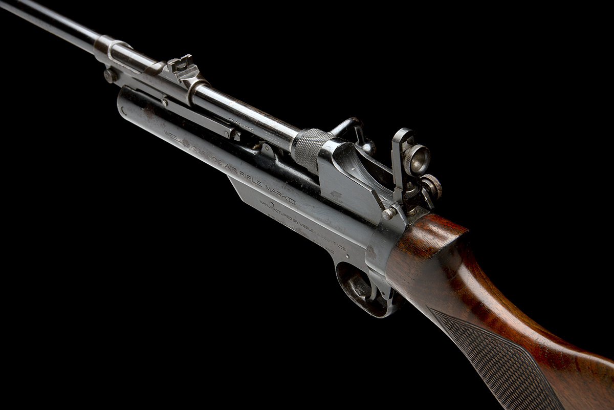 late model circa 1937, with matching number 25 1/2in. barrel, ramp fore-sight, elevating notch rear-sight, rotating bolt breech-lock, folding peep-sight to rear, plain air-chamber with make, model details and five lines of patents, trigger unit with maker and address, semi saw-handled chequered walnut butt-stock, the underside of the semi pistol-grip stamped 'MADE IN ENGLAND', ribbed heel-plate and no provision for fore-end, the whole retaining a strong amount of original finish with small patches of shallow pitting to left hand side of air-chamber, overall length 42in., weight approximately 6 3/4lbs.