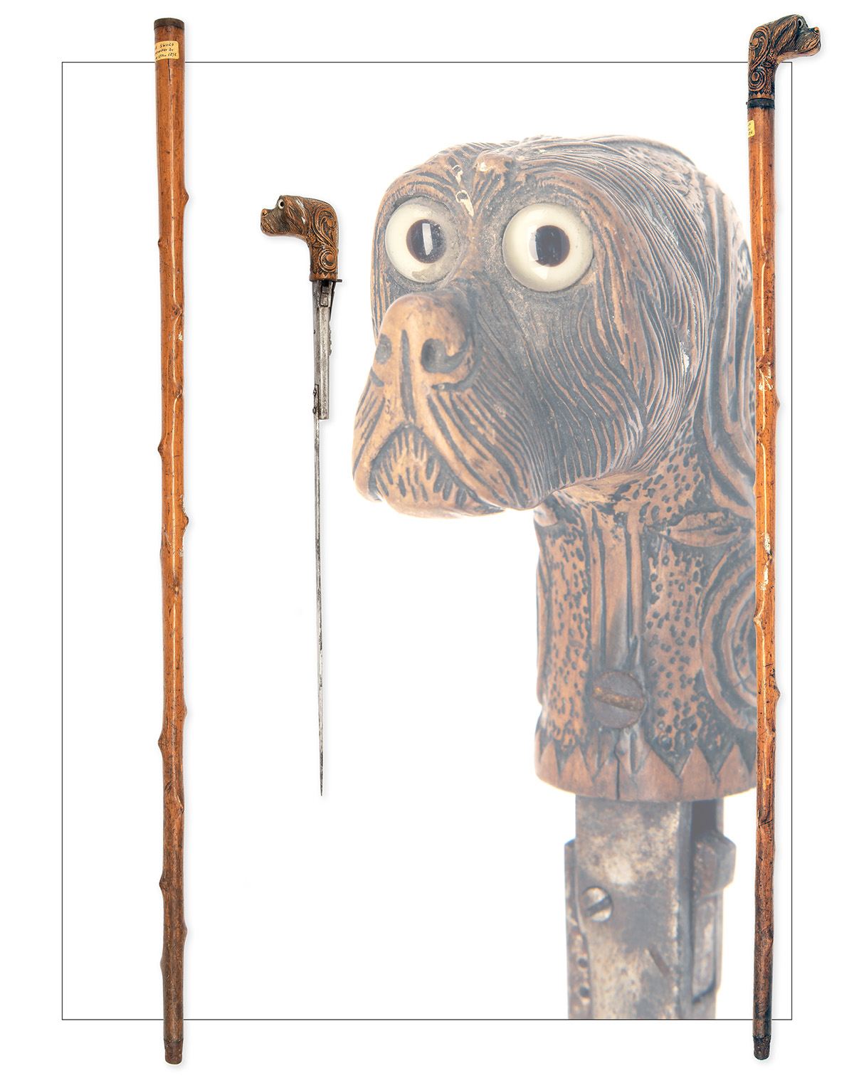 Spanish circa 1895, with plain unedged 12 1/2in. needle-point blade mounted near the muzzle of an octagonal 2 3/4in. barrelled in-line pistol mechanism (barrel with drilled vent for blank), the rear with side-hammer, swing-open breech and side button trigger, the pommel carved as the head of a hound fitted with glass eyes, the neck carved with open scrolls, catch at rear to lock it into the knobbly cane shaft with iron mounts, the neck with old gummed label stating 'SPANISH SWORD STICK PURCHASED BY JNA IN SPAIN 1898'