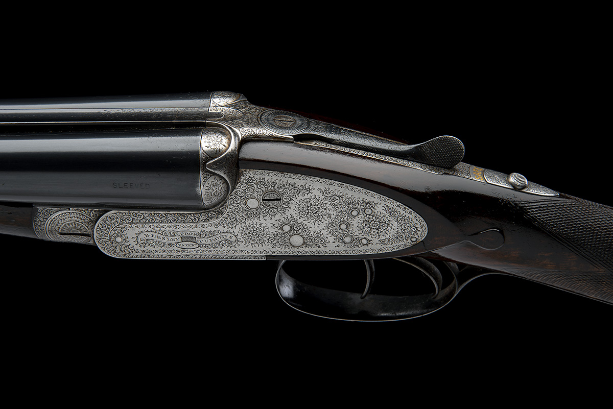 circa 1891, 26in. sleeved nitro barrels (in 1970), the rib engraved 'F. BEESLEY (FROM PURDEYS). 85. EDGWARE ROAD. LONDON.', 2 1/2in. chambers, bored approx. 1/4 and 3/4 choke, action incorporating Beesley patent no. 8657 of 1886, treble-grip action with arcaded fences, slender toplever, automatic safety with gold-inlaid 'SAFE' detail, bouquet and scroll engraving (some distortion to the triggerplate tang), 14 1/4in. figured stock including 1in. wooden extension, weight 5lb. 14oz., in its makers brass-cornered oak and leather case with red baize-lined interior fitted for 28in. barrels, lid interior with 'F. Beesley, Late on the Staff of James Purdey & Sons' trade label inked with the gun serial number and charge information