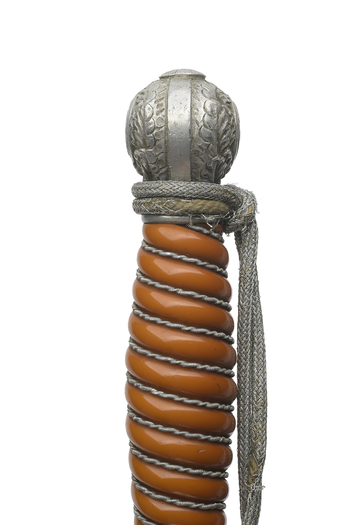 circa 1939, with plain stiletto 9 3/4in. blade, finely detailed aluminium crossguard in the form of an eagle with out-stretched drooping wings clutching a swastika in its talons, the reverse pebbled and the top-surfaces carved with oak-leaves, orange-coloured celluloid grip with spiral wire binding and bulbous swastika alloy pommel, complete with its correct pebbled scabbard, twin suspension rings and its bullion portapee knot