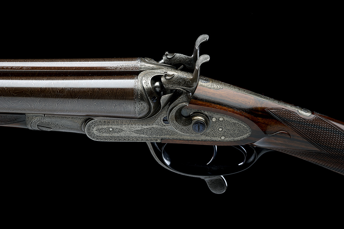 circa 1874, 30 7/8in. nitro reproved bold damascus barrels (slightly shortened), rib engraved 'Wm. NEEDLER. MAKER. HULL.', (likely refreshed), 2 5/8in. chambers (67mm), bored approx. true cyl. and imp. cyl. choke, sculpted Jones patent rotary underlever, carved percussion fences with button strikers, rebounding sidelocks with ornately carved hammers, fine feathered border and acanthus scroll engraving, 14 3/8in. highly-figured replacement stock, fore-end with sculpted horn finial (light damage) with Anson 1873 patent release, weight 7lb. 10oz.
