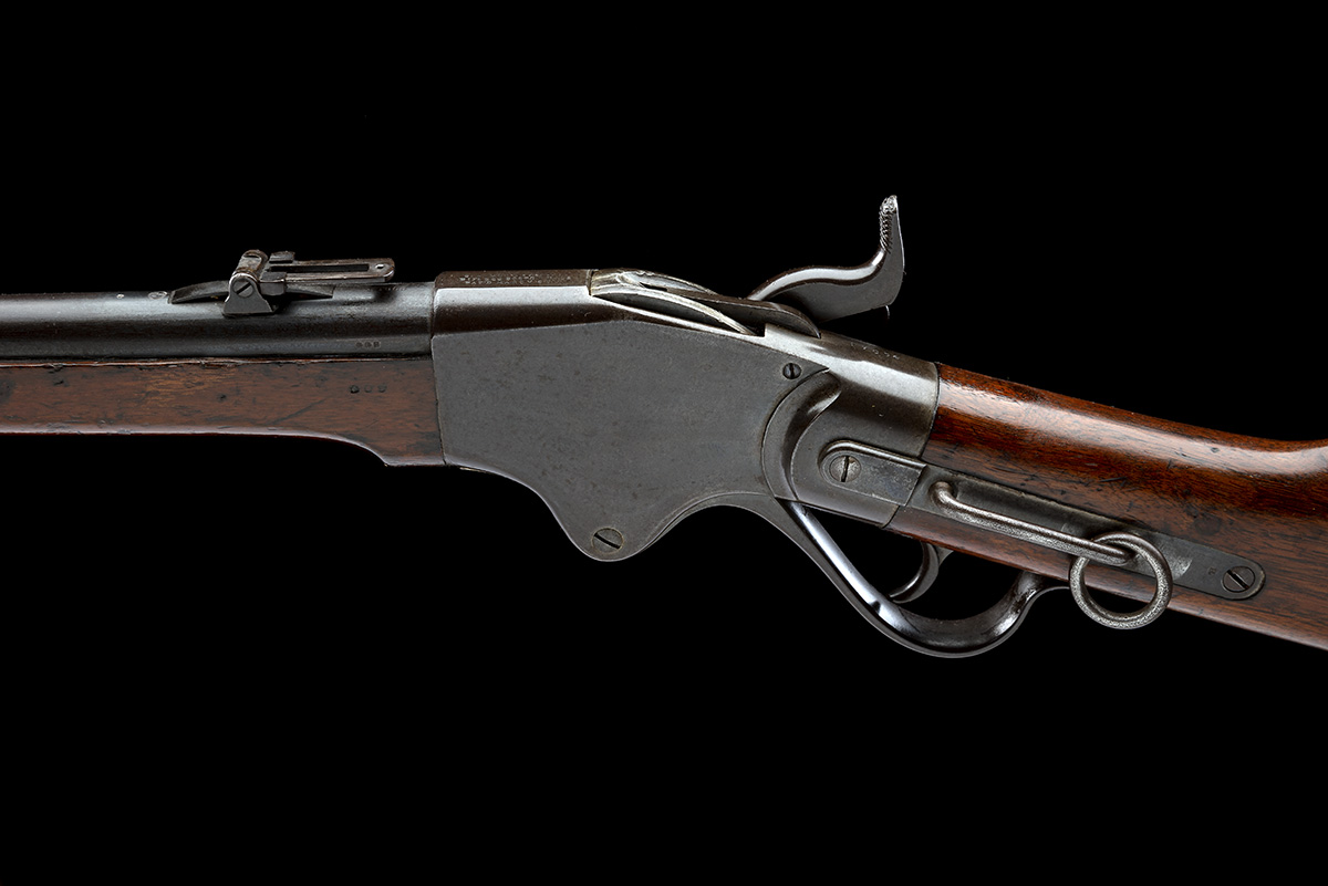 circa 1863-65, with round 22in. barrel, dove-tailed fore-sight blade and folding ladder rear-sight, plain receiver with under-lever opening, the top of receiver stamped 'SPENCER REPEATING RIFLE CO. BOSTON, MASS PAT'D MARCH 6 1860 (rubbed), plain back-action side-mounted lock with external hammer, walnut straight-hand butt-stock with magazine tube concealed in the iron heel-plate, side mounted iron saddle bar and ring, walnut splinter fore-end with single iron barrel-band, strong traces of finish