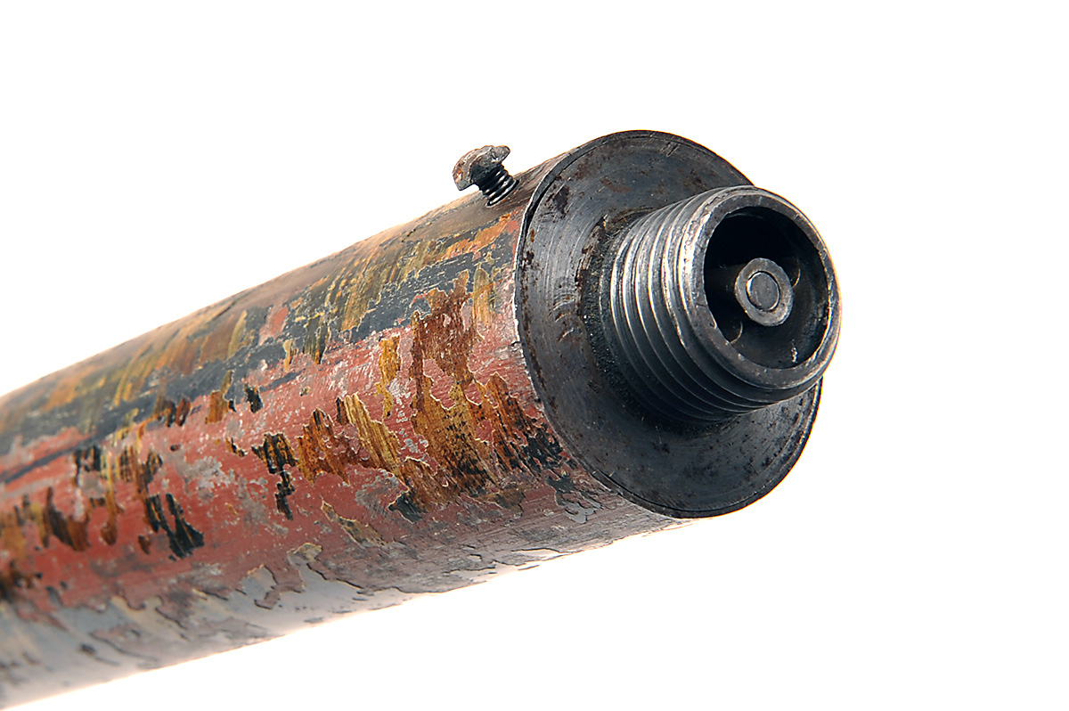 unsigned, circa 1870, the tapering 20 1/2in. barrel section with removable rifled insert and nose-cap with captive mahogany ramrod, aperture for cocking key and concealed button trigger, plain straight air-reservoir with cranked horn handle, the whole painted in imitation of hazelwood and retaining much finish, complete with replacement key