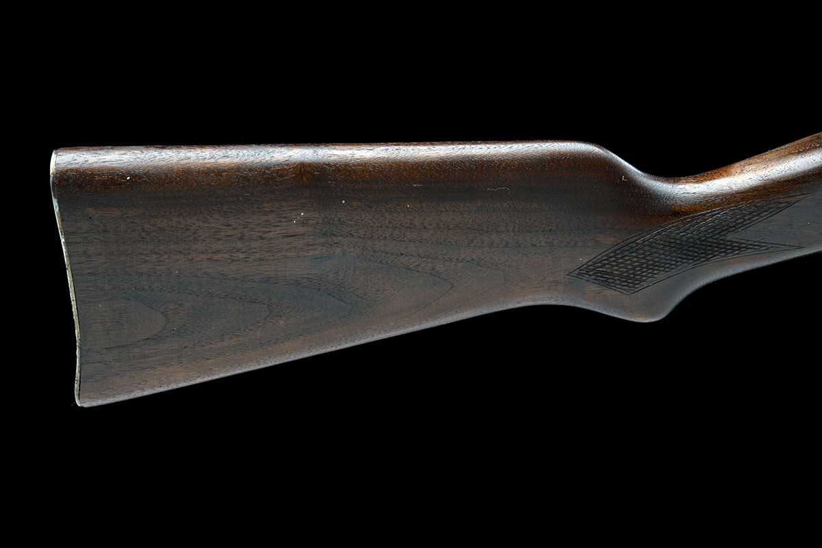 circa 1935, with black painted 20in. barrel, bolt action blued breech marked 'MFD BY CROSMAN ARMS CO. ROCHESTER N.Y. on the left side and 'CROSMAN .22 PAT. OCT. 28 1924, OTHER PATENTS PENDING' and fitted with ten-shot tube magazine, black painted alloy receiver, knurled cocking piece to rear, peep-sight to top of breech, wood semi pistol-grip butt-stock with colour-hardened heel-plate, chequered wood fore-arm, the whole retaining the majority of its factory finish and generally in collector's external condition