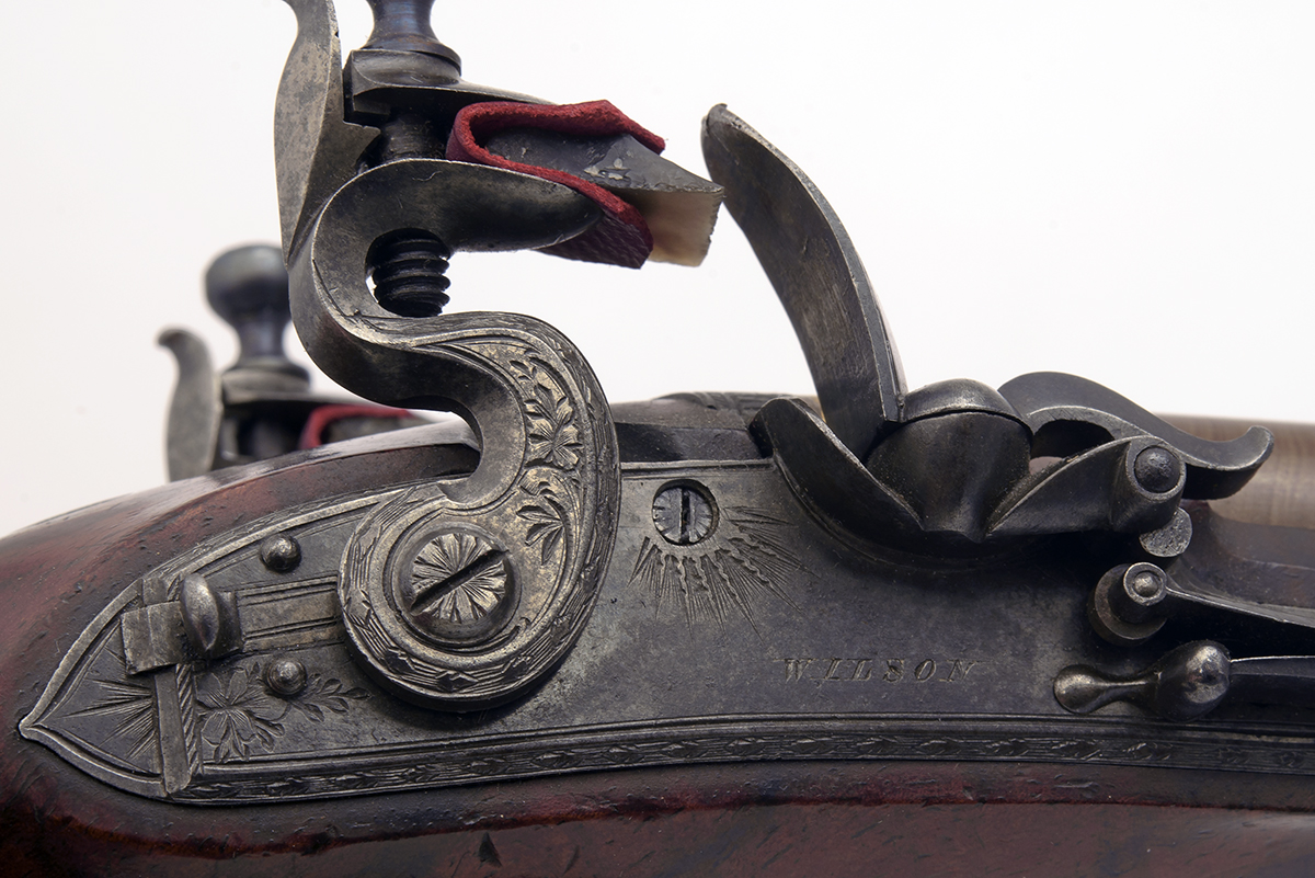 circa 1810, with expertly rebrowned 4 3/8in. side by side barrels, the top-rib signed 'WILSON, LONDON', small applied crescent fore-sight, gold bands at breech, platinum lined touch-holes, fully engraved top-tang with shallow sighting groove, border engraved bevel-edged locks signed 'WILSON' below the semi rainproof pans, sliding safes behind the engraved swan-necked cocks and rollers to the frizzen-springs, walnut three-quarter stock with chequered bag-shaped butt, engraved and blued trigger guard bow and horn-tipped ramrod, strong amount of original finish to iron furniture