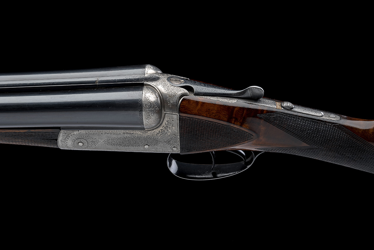circa 1897, 28in. replacement nitro reproved barrels (wall thicknesses well below recommended minimum, ejectors require attention), rib engraved 'Wm. POWELL & SON. CARR'S LANE. BIRMINGHAM.', 2 1/2in. chambers, bored approx. 1/4 choke in both, treble-grip action, toplever engraved '2', automatic safety, border and partial acanthus scroll engraving with a further floral spray, 14 3/8in. figured stock with chequered side panels, weight 6lb. 2oz.
