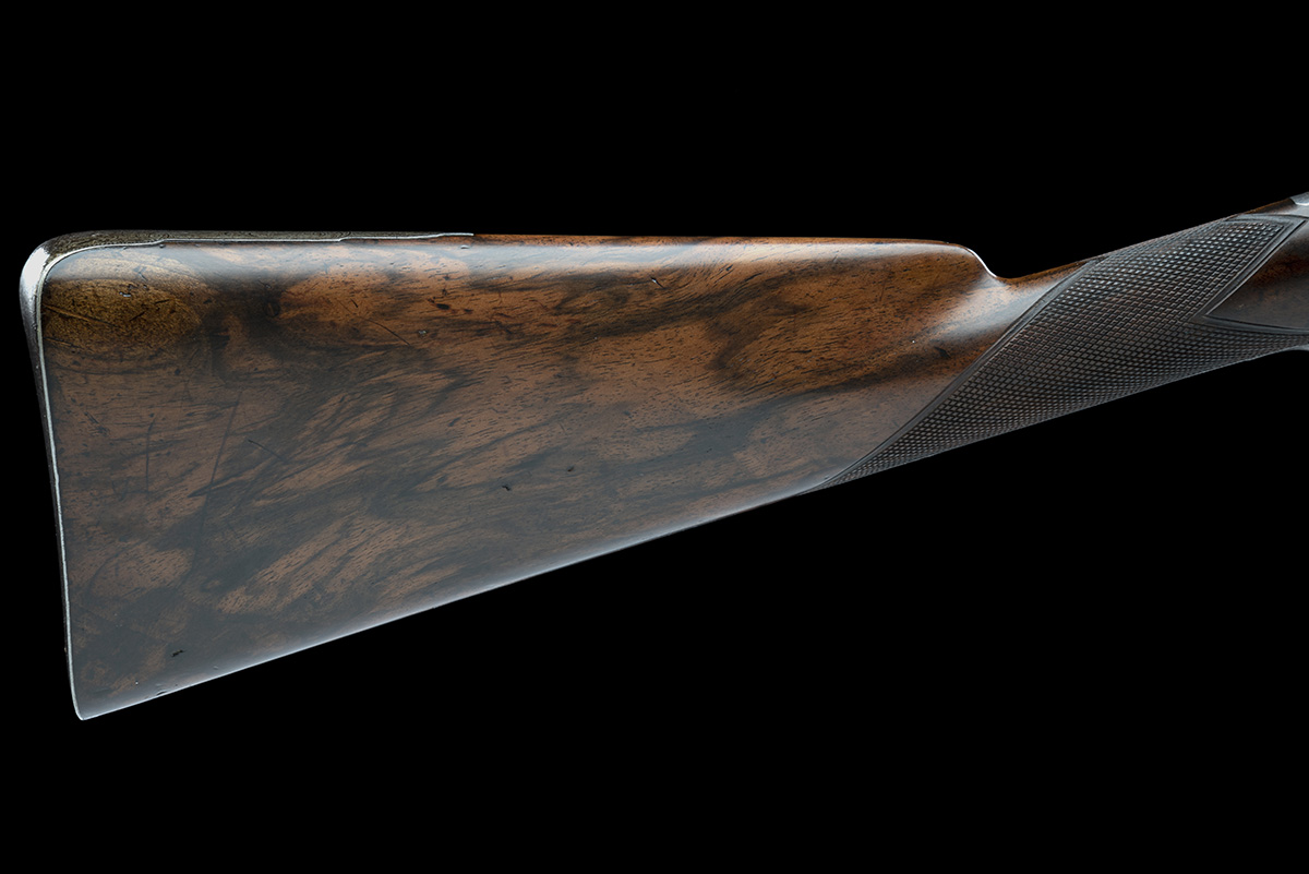for 1824, with 30in. three stage octagonal to polygonal to round barrel, the top flat at the breech engraved 'PURDEY, PRINCES ST. LEICESTER SQUARE, LONDON' (refreshed), patent breech with two platinum lines and poincon stamped 'PURDEY LONDON', foliate engraved fixed breech with some loss to engraving from flash erosion and pitting, borderline engraved lock with a sunburst to centre top and panels of foliate scroll work and the makers name 'PURDEY' to centre, the cock with dolphin head and engraved to match, the nose worn and partly missing, figured walnut half-stock, with chequered wrist (refreshed) inset with a silver escutcheon initialled 'W.W.', the iron mounts, long tang decorated with foliate engraving, the trigger-guard engraved to match (engraving faint and worn), replacement horn nose-cap, the barrel rebrowned over pitting, particularly at breech, stock refinished with some well executed repairs, contained in a refurbished relined and partitioned green baize lined brass-bound mahogany case, the lid with reproduction Purdey trade card, accessories include a leather shot pouch and a mainspring cramp