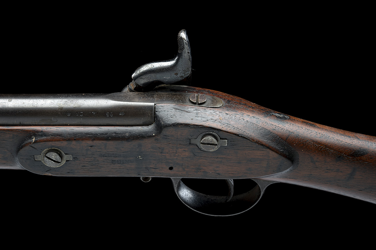 with 33in. Birmingham proofed barrel with block and blade front-sight and reversed type ladder rear-sight, fitted with P56 type bayonet lug, borderline engraved lock with a crown on the tail and signed to the centre 'JAMES BRYCE / EDINBURGH', regulation iron mounted full walnut stock, the counter lock side also stamped 'JAMES BRYCE / EDINB.', complete with sling swivels and rod. A typical private purchase volunteer short rifle of the 1860 period