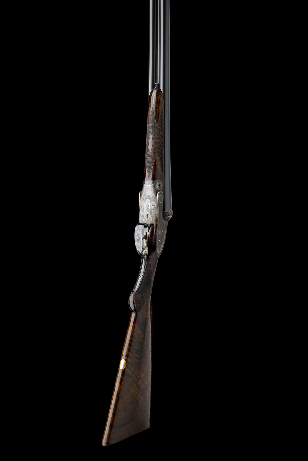for 1894, 32in. nitro reproved Whitworth-steel chopperlump barrels with broad tapered rib engraved 'J. PURDEY & SONS. AUDLEY HOUSE. SOUTH AUDLEY STREET. LONDON. MADE OF SIR JOSEPH WHITWORTH'S FLUID-PRESSED STEEL', the breech end engraved '2' and with acanthus scroll detailing, 3in. chambers, bored approx. 3/4 and 1/2 choke, large treble-grip action with hidden third bite and side-clips, removable striker discs, toplever engraved '2', automatic safety with gold-inlaid 'SAFE' detail, arrow cocking-indicators, the fences carved in high relief with stylised floral motifs on a matted background, best fine acanthus scroll engraving with floral bouquets, retaining much original colour-hardening and finish, 14 3/4in. well-figured semi-pistolgrip stock (with well executed likely contemporary conversion to pistolgrip), weight 8lb., in its brass-cornered oak and leather guncase.