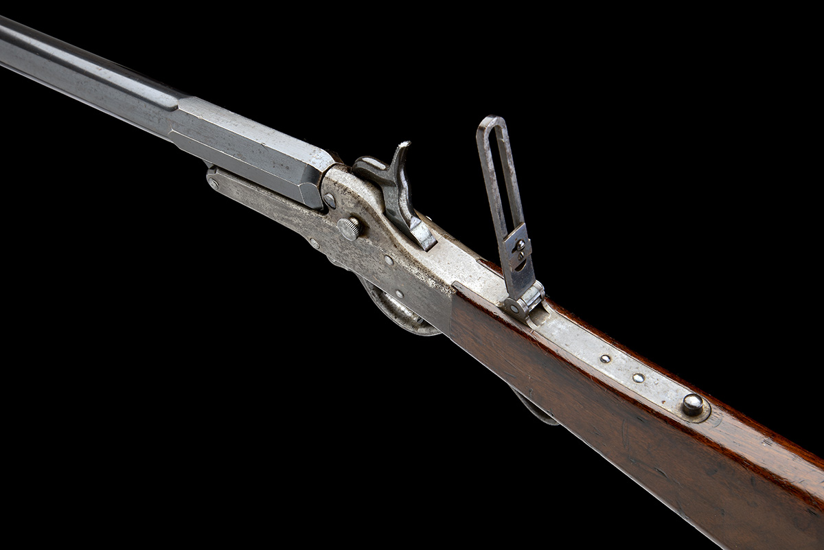 for between 1860-61, with blued octagonal to round 20in. barrel, nickel crescent fore-sight, no provision on barrel for rear-sight, open iron frame (strong traces of colour) fitted with a flush trapdoor for Maynard's tape primer on the right hand side and advancing wheel on the left, the right side marked 'MAYNARD'S ARMS CO. WASHINGTON', the left 'MANUFACTURED BY THE MASS. ARMS CO. CHICOPEE FALLS', central hammer with offset nose, factory fitted folding ladder tang-sight, walnut slab-sided butt-stock stamped '442' on the left side and with heavy iron crescent heel-plate, reverse opening 'patchbox' for spare primer rolls, the lid marked 'MAYNARD PATENTEE MAY 27 1851, JUNE 17 1856', the inside of box with paper label printed with 'MAYNARD PATENTEE' and six patent dates to December 6th 1859, underlever opening, the lever forming the trigger-guard, rare factory fitted double set triggers, much finish and colour remaining throughout
