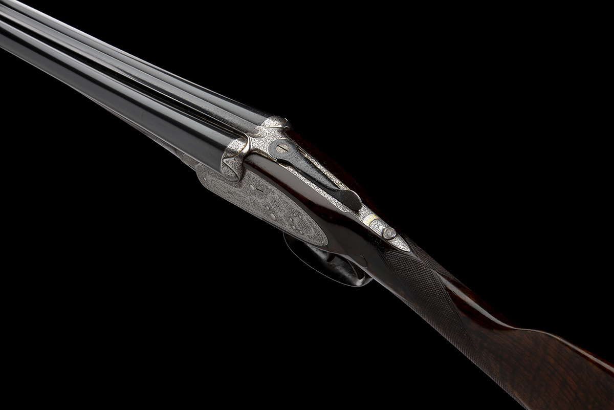 circa 1891, 26in. sleeved nitro barrels (in 1970), the rib engraved 'F. BEESLEY (FROM PURDEYS). 85. EDGWARE ROAD. LONDON.', 2 1/2in. chambers, bored approx. 1/4 and 3/4 choke, action incorporating Beesley patent no. 8657 of 1886, treble-grip action with arcaded fences, slender toplever, automatic safety with gold-inlaid 'SAFE' detail, bouquet and scroll engraving (some distortion to the triggerplate tang), 14 1/4in. figured stock including 1in. wooden extension, weight 5lb. 14oz., in its makers brass-cornered oak and leather case with red baize-lined interior fitted for 28in. barrels, lid interior with 'F. Beesley, Late on the Staff of James Purdey & Sons' trade label inked with the gun serial number and charge information