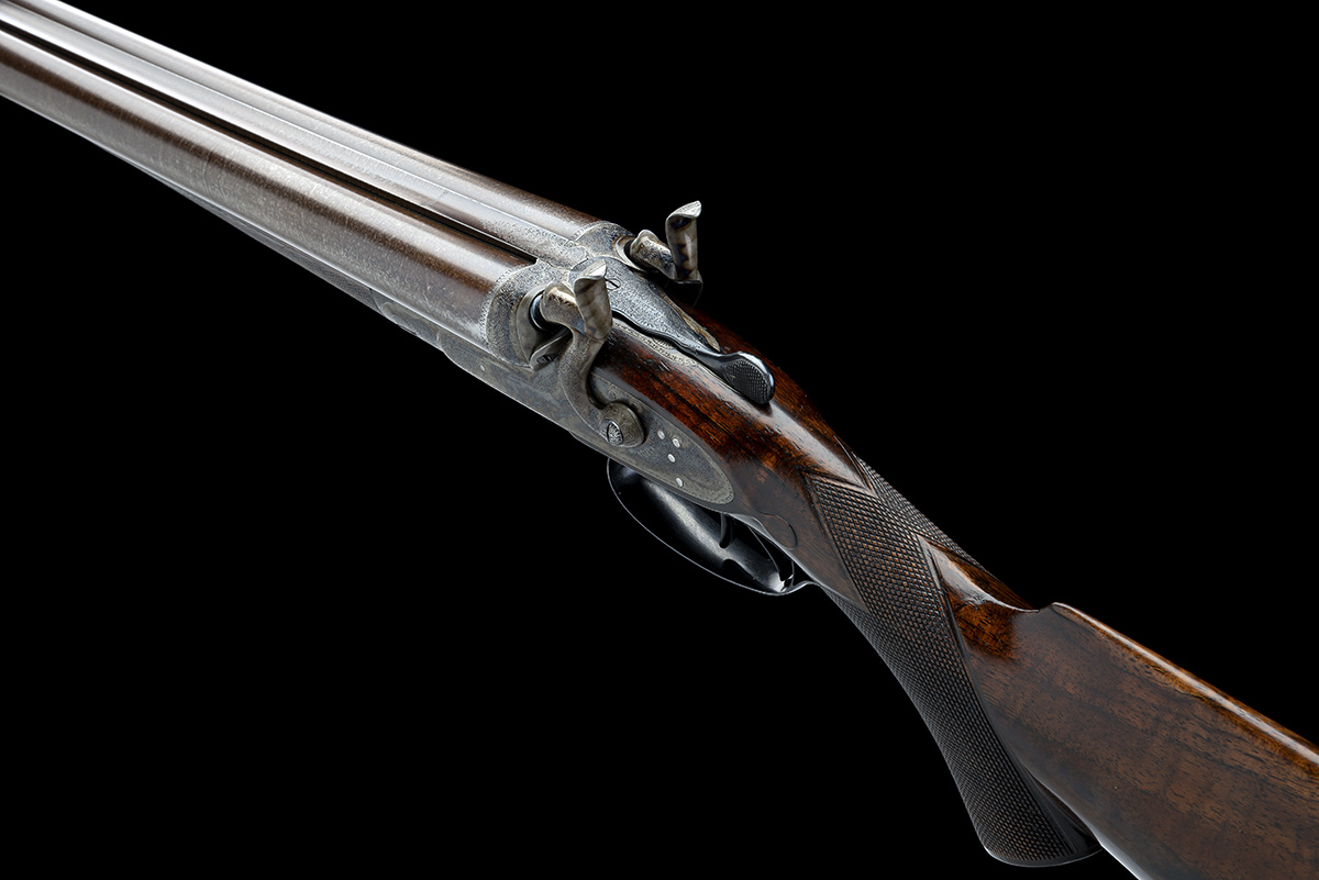 circa 1875, 28in. nitro reproved damascus barrels (in 2005), rib engraved 'W. & C. SCOTT & SON. MAKERS & PATENTEES. 10 Gt. CASTLE STREET. REGENT CIRCUS. LONDON.', 2 3/4in. chambers, bored approx. imp. cyl. and 1/4 choke, action incorporating Scott patent toplever and Purdey double-bite, Scott patent 2752 of 25th October 1865, and Purdey patent 1104 of 2nd May 1863, use number 5489, carved percussion fences, broad button strikers, rebounding locks, border and partial scroll engraving surrounding vignettes of hound flushing game, retaining much renewed colour-hardening and finish, fore-end with Scott patent 'key' release, patent no. 3756 of 1873 (slight damage to wood at tip), 14 1/4in. figured pistolgrip stock including 3/4in. extension, with removable comb-raiser, weight 6lb. 11oz., in a brass-cornered canvas and leather case