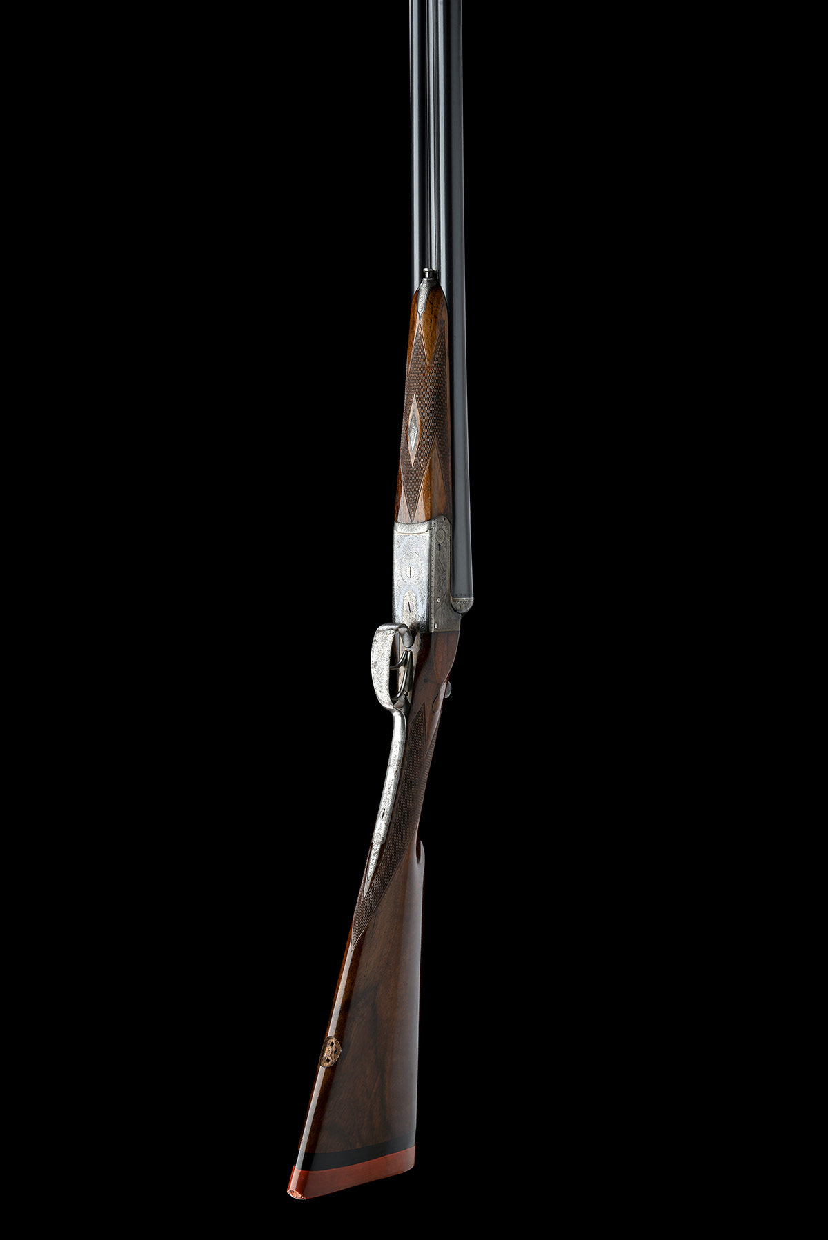 circa 1945, 26in. nitro barrels with Churchill-type rib, tubes engraved 'JOHN MACPHERSON. INVERNESS.', 2 1/2in. chambers, bored approx. imp. cyl. and 3/4 choke, treble-grip action, automatic safety with gold-inlaid 'SAFE' detail, border and partial scroll engraving surrounding vignettes of game, retaining traces of original colour-hardening and finish, 14 1/2in. stock (escutcheon removed) including 1in. rubber recoil pad, weight 6lb. 7oz.