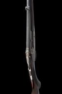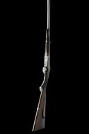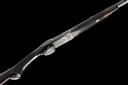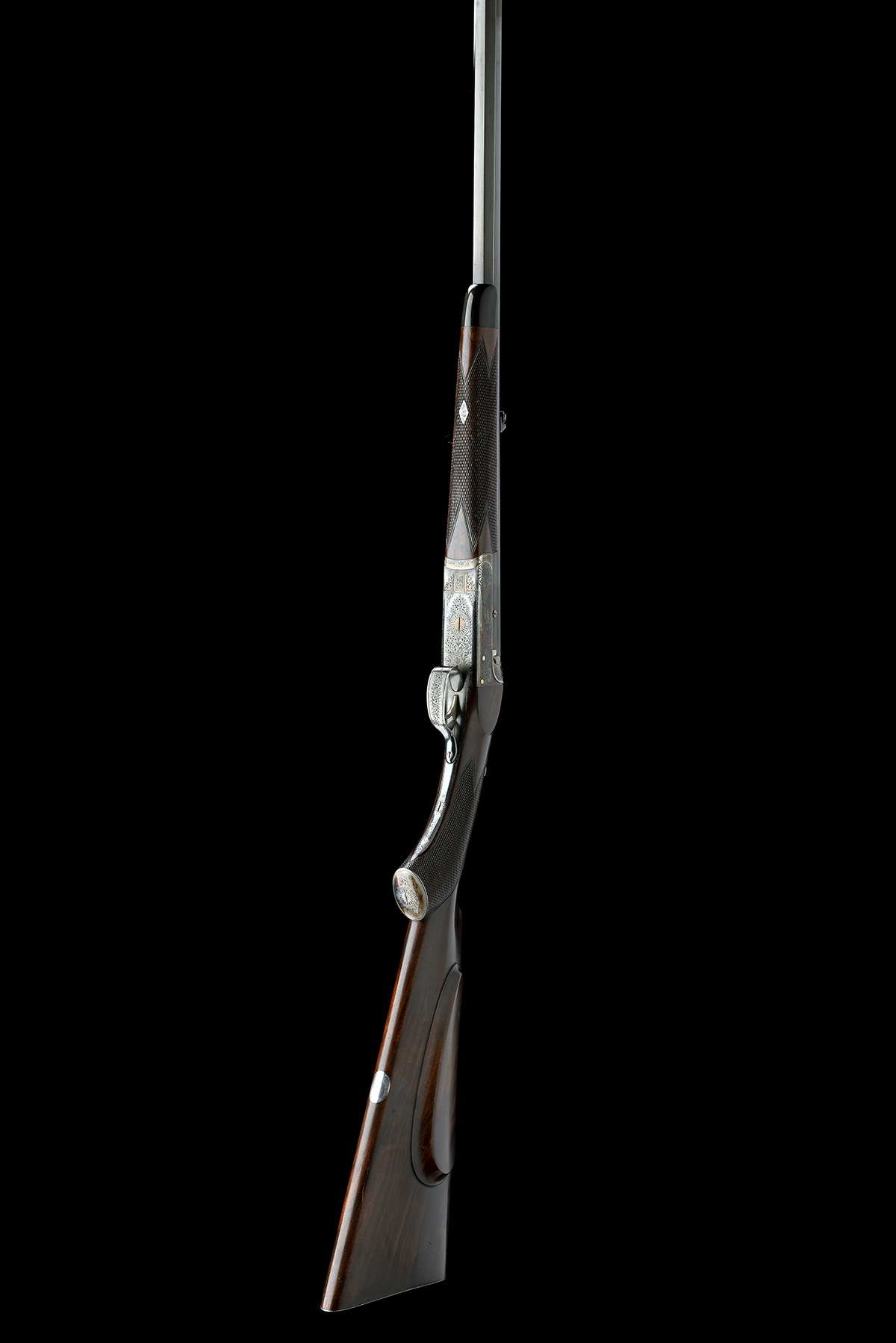 for 1908, 26 1/4in. black powder only octagonal barrel with matted sighting flats, standing notch rear sight with two folding leaf sights marked for 50, 100 and 150 yards and with white metal-inlaid sight lines, dove-tailed bead fore-sight, engraved 'JOHN DICKSON & SON. EDINBURGH.', and '250', and with a feathered border at the breech-end, non-selective ejector, the action with carved teardrop fences, removable striker disc, automatic safety with gold-inlaid 'SAFE' detail, border and bold acanthus scroll engraving, retaining much original colour-hardening and finish, 14 3/4in. figured pistolgrip stock with engraved and colour-hardened steel pistolgrip-cap, cheekpiece, including blued steel buttplate, Hackett-type snap-on splinter fore-end with horn finial, weight 5lb. 11oz.