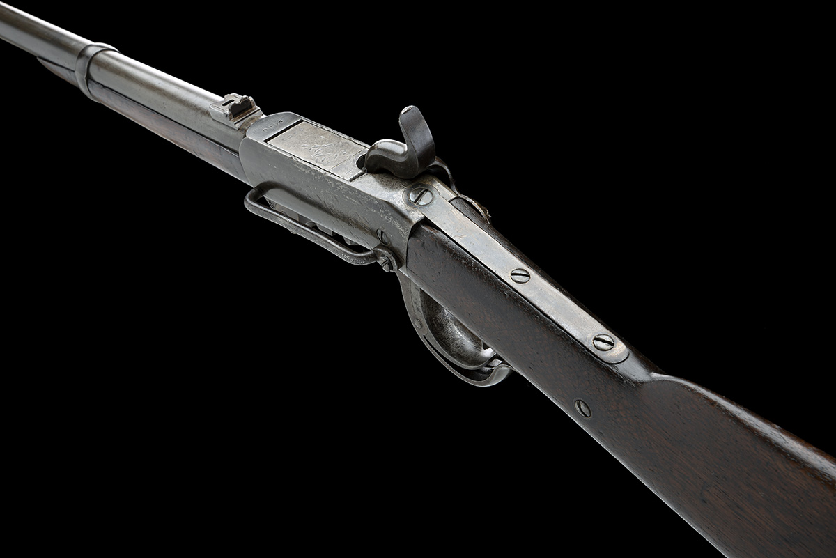 with 21in. barrel fitted with pinched blade front-sight, and leaf battle rear-sights to 500 yards, the breech top stamped 'BURNSIDE PATENT / MODEL OF 1864', (faint), interestingly although marked "Model of 1864" deliveries started in 1863 and this is one of the early deliveries from that year, breech block and action stamped with the serial number 6954, and for the convenience of the trooper a side-rib is fitted to the left-side of the action, back-action lock stamped in small letters 'BURNSIDE RIFLE CO. / PROVIDENCE R.I.', (faint), two piece iron mounted walnut stock, the splinter fore-end with one spring retained band, the butt with crescent butt-plate