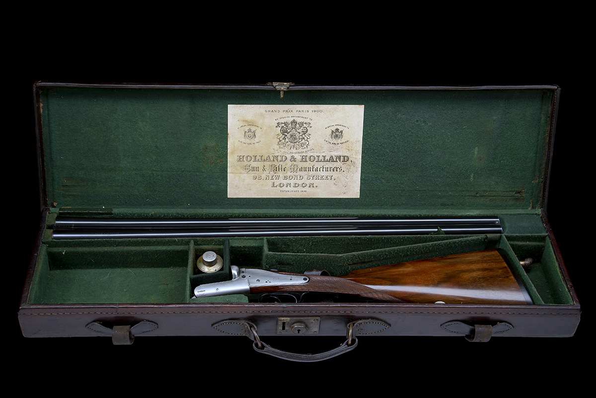circa 1910, 28in. sleeved nitro barrels (in 2011), the tubes re-engraved 'HOLLAND & HOLLAND. 98. NEW BOND STREET. LONDON.', the rib re-engraved 'C GRADE' at the breech end, 2 3/4in. chambers, bored approx. true cyl. and 1/4 choke, action with patent gas checks, automatic safety with engraved 'SAFE' detail, cocking-indicators, border engraving, the lockplates signed 'H & H', brushed bright and reblued finish overall, 14 1/2in. replacement stock including 3/8in. buttplate, fore-end with Deeley & Edge patent release and replacement wood, weight 6lb. 13oz., in a leather hammergun case with Holland & Holland trade label