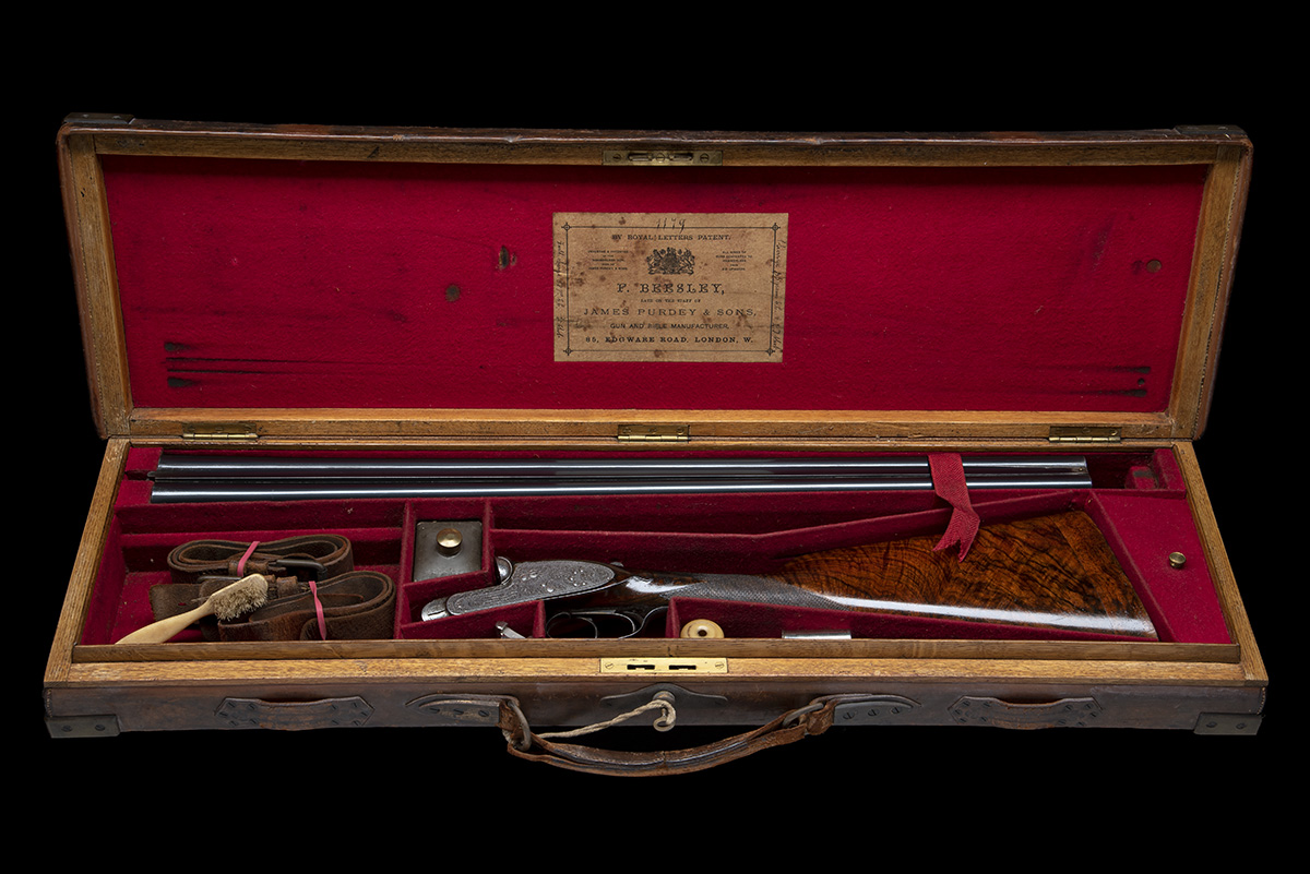 circa 1891, 26in. sleeved nitro barrels (in 1970), the rib engraved 'F. BEESLEY (FROM PURDEYS). 85. EDGWARE ROAD. LONDON.', 2 1/2in. chambers, bored approx. 1/4 and 3/4 choke, action incorporating Beesley patent no. 8657 of 1886, treble-grip action with arcaded fences, slender toplever, automatic safety with gold-inlaid 'SAFE' detail, bouquet and scroll engraving (some distortion to the triggerplate tang), 14 1/4in. figured stock including 1in. wooden extension, weight 5lb. 14oz., in its makers brass-cornered oak and leather case with red baize-lined interior fitted for 28in. barrels, lid interior with 'F. Beesley, Late on the Staff of James Purdey & Sons' trade label inked with the gun serial number and charge information