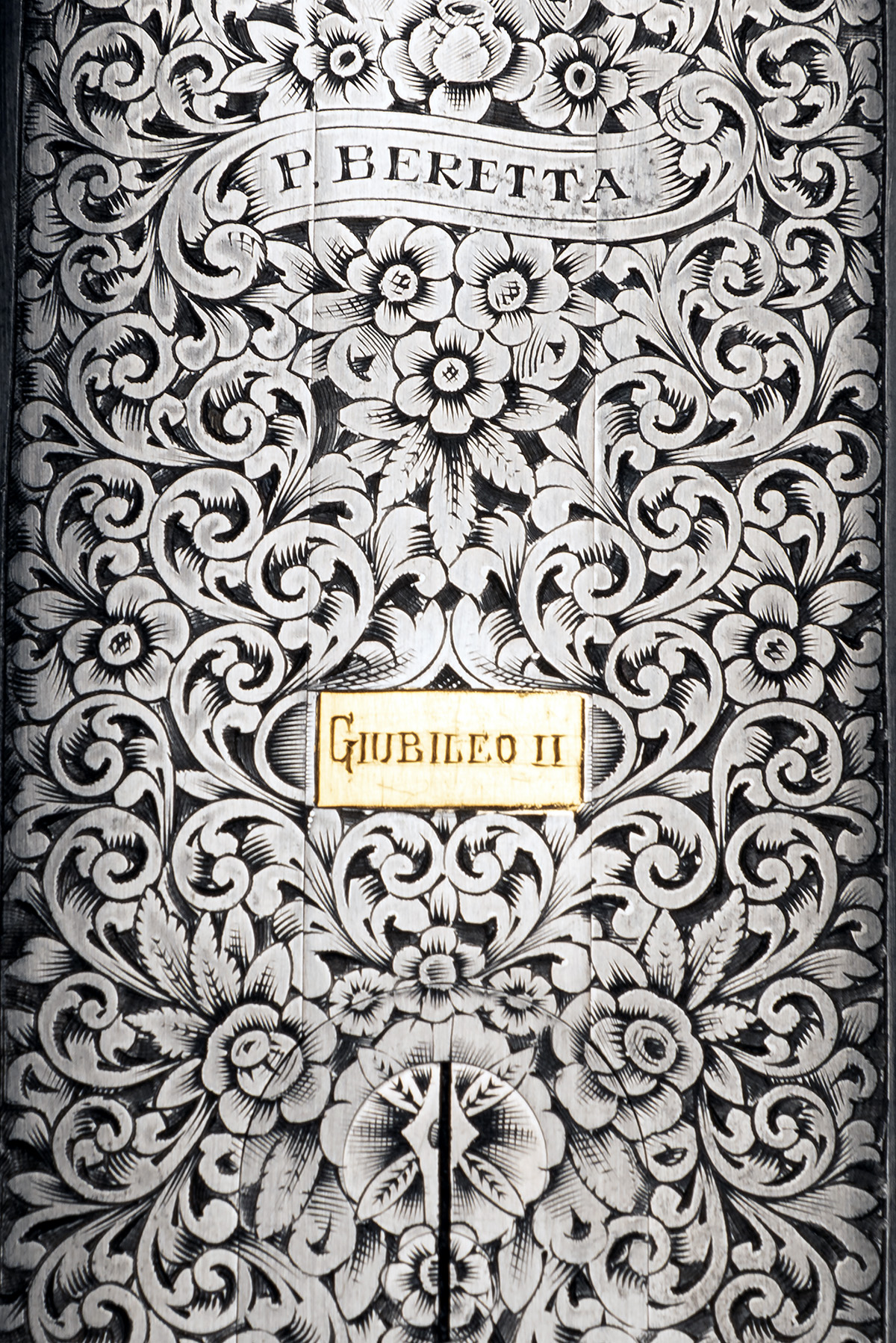 dated 2003, 28in. Excelsior high strength alloyed steel nitro monobloc barrels, 3in. chambers, bored approx. 1/4 and 1/2 choke, automatic safety with integral barrel selector switch, the action, fences and furniture engraved with floral scrollwork, the decorative sideplates engraved en suite, the underside inlaid 'GIUBILEO II' in gold, the triggerplate signed 'Bottega C. Giovanelli Inc. Bellini S', bright finish, the fore-end with ejector / non-ejector switch, 14 1/2in. figured stock including buttplate, weight 6lb. 9oz., in its makers case with some paperwork and a Stratton 'The Retainer' tie-pin, and with cardboard outer