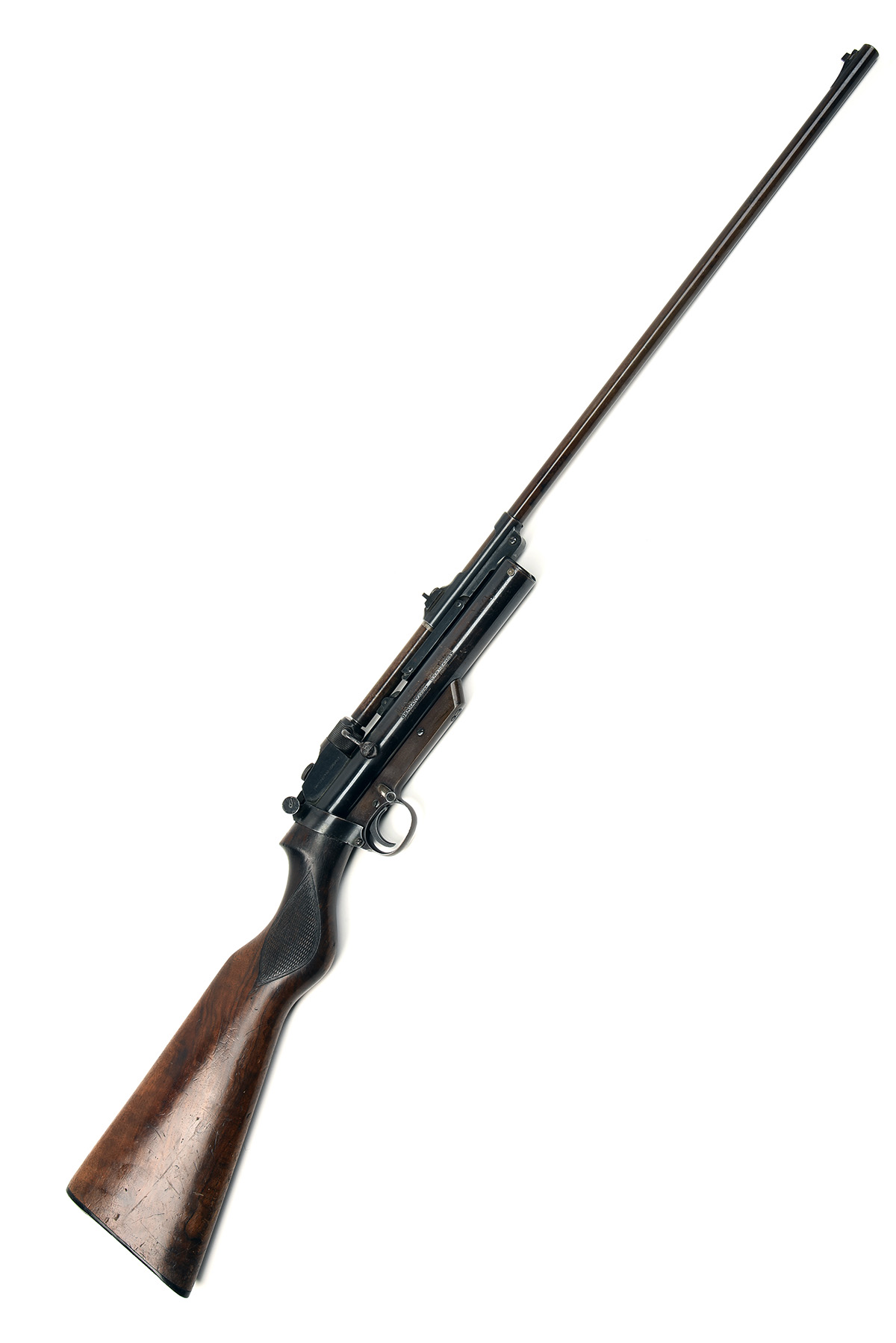 circa 1934, with matching number 25 1/2in. barrel fitted with a ramp and blade fore-sight, push-button barrel release, elevating dove-tailed rear-sight to the barrel cradle, rotating bolt-handled barrel-lock, second style peep-sight to rear, blued air-chamber with model details and patents, anti bear-trap device, trigger unit with makers name and address, swinging safety catch, walnut semi pistol-grip butt-stock, ribbed horn heel-plate, the whole retaining a strong amount of original blued finish