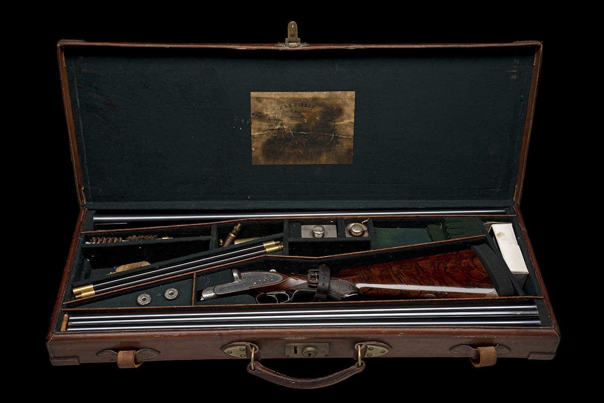 toplever gold-inlaid '2', automatic safety with gold-inlaid 'SAFE' detail, gold-inlaid cocking-indicators, fine acanthus scroll engraving with central floral bouquets, 14 5/8in. well-figured replacement Prince of Wales pistolgrip stock with pistolgrip-cap, weight 6lb. 9oz. (No.2) and 6lb. 10oz. (No.2 Choke), in a leather case with oak partitioning and provision for both sets of barrels
