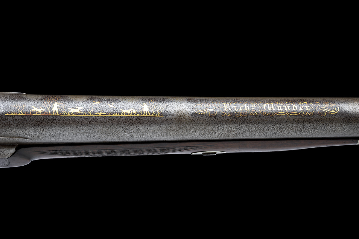 circa 1835, with round 33in. barrel re-proofed in 1985 (mild external pitting and lightly cleaned of finish), the top signed in gold script 'RICHD MANDER' together with an inlet gilt silhouette scene of hunters flushing game-birds with dogs, scroll engraved breech, scroll engraved top-tang, border, scroll and game-scene engraved flat bar-action lock, scroll engraved hammer, chequered walnut half-stock with white-metal oval escutcheon to the wrist, iron long-spur scroll engraved heel-plate, square-backed trigger-guard with scrolled pistol-grip tang, white-metal take-down barrel-key escutcheons and fore-end tip, under-barrel rib with two thimbles and period ramrod