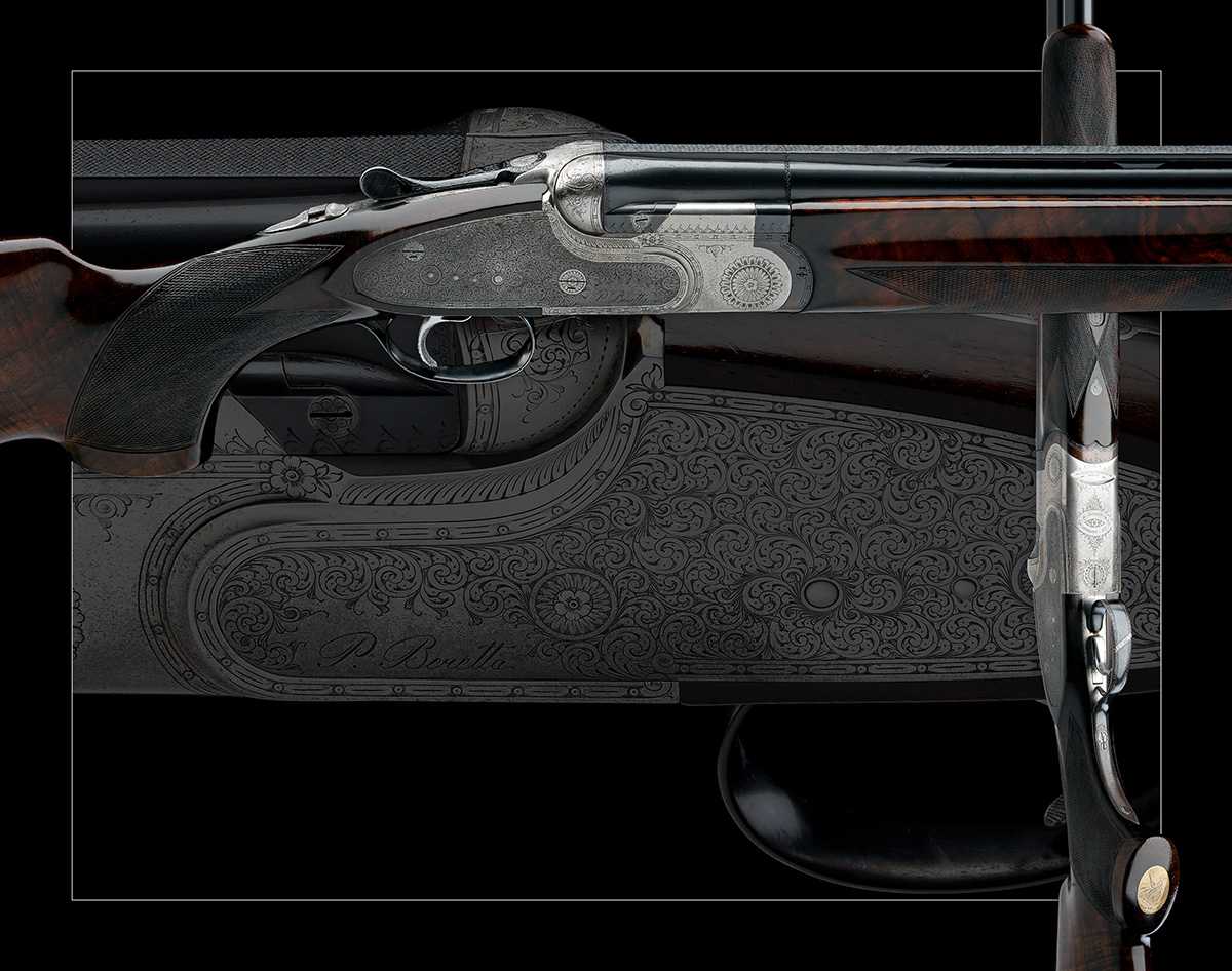 for 1985, 28in. nitro barrels with 8mm ventilated matt top-rib, 2 3/4in. chambers, bored approx. 1/4 and 1/2 choke, hold-open toplever, automatic safety with engraved 'S' detail and integral barrel-selector switch, border and fine acanthus scroll engraving, bright and blued finish, 14 1/2in. figured pistolgrip stock including horn buttplate, pistolgrip with brass escutcheon engraved with a pricked pheasant, weight 7lb. 8oz.