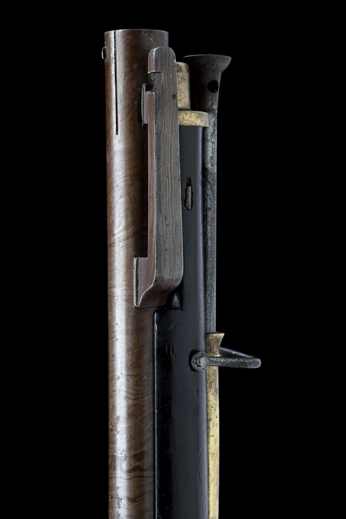 with 30 1/4in. iron twist barrel professionally rebrowned and having a gold-lined touch-hole, fitted with sword bayonet bar at muzzle, small blade front-sight, three leaf back-sight, the flat at the breech engraved with the makers name "WM. MOORE, RIFLE GUNMAKER 118 WHITE CHAPEL HIGH ST. LONDON" the barrel is rifled with 11 grooves, plain flat bevelled lockplate with stepped tail and bolt safety, the makers name "W. MOORE" set in a recess in a gold block to the centre, vee shaped rainproof pan and roller to frizzen spring, and swan-neck cock, the lock is detented and the rifle has a set trigger, brass-mounted full walnut stock with finely chequered wrist, and raised cheek-rest, the fore-end is of the slit pattern dating the rifle to after 1805, the mounts include scroll trigger-guard, rectangular patchbox and two rammer pipes, the rifle is fitted with its original adjustable peep-sight and complete with its sling swivels and rammer. The stock with an old and expertly executed repair to the stock by the lock.