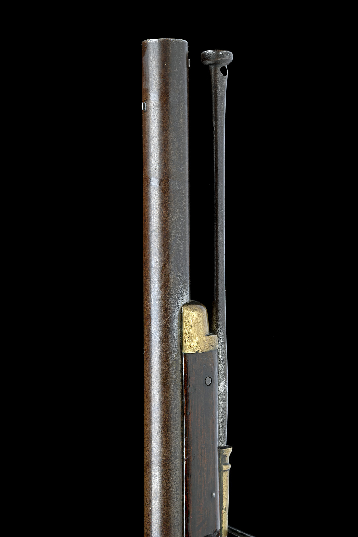 30in. barrel rifled with seven grooves of slightly rounded form giving 1/4 turn in length of barrel and fitted with a patent chambered breech, small blade fore-sight and on the underside a small stud for a sword bayonet, hinged leaf rear-sight, fitted with a borderline engraved flat style lock bearing the makers name 'BECKWITH' to the centre, brass mounted full walnut stock, the fore-end slit to prevent to prevent jamming of the rod, two rammer pipes, nosecap, scroll trigger-guard, long tanged butt-cap and patchbox, the lid engraved 'JOHN PYE / GRAY'S INN RIFLE CORPS' contained inside the patchbox a set of Baker implements including ball drawer, cleaning jags and turnscrew, complete with sling swivels and original rod