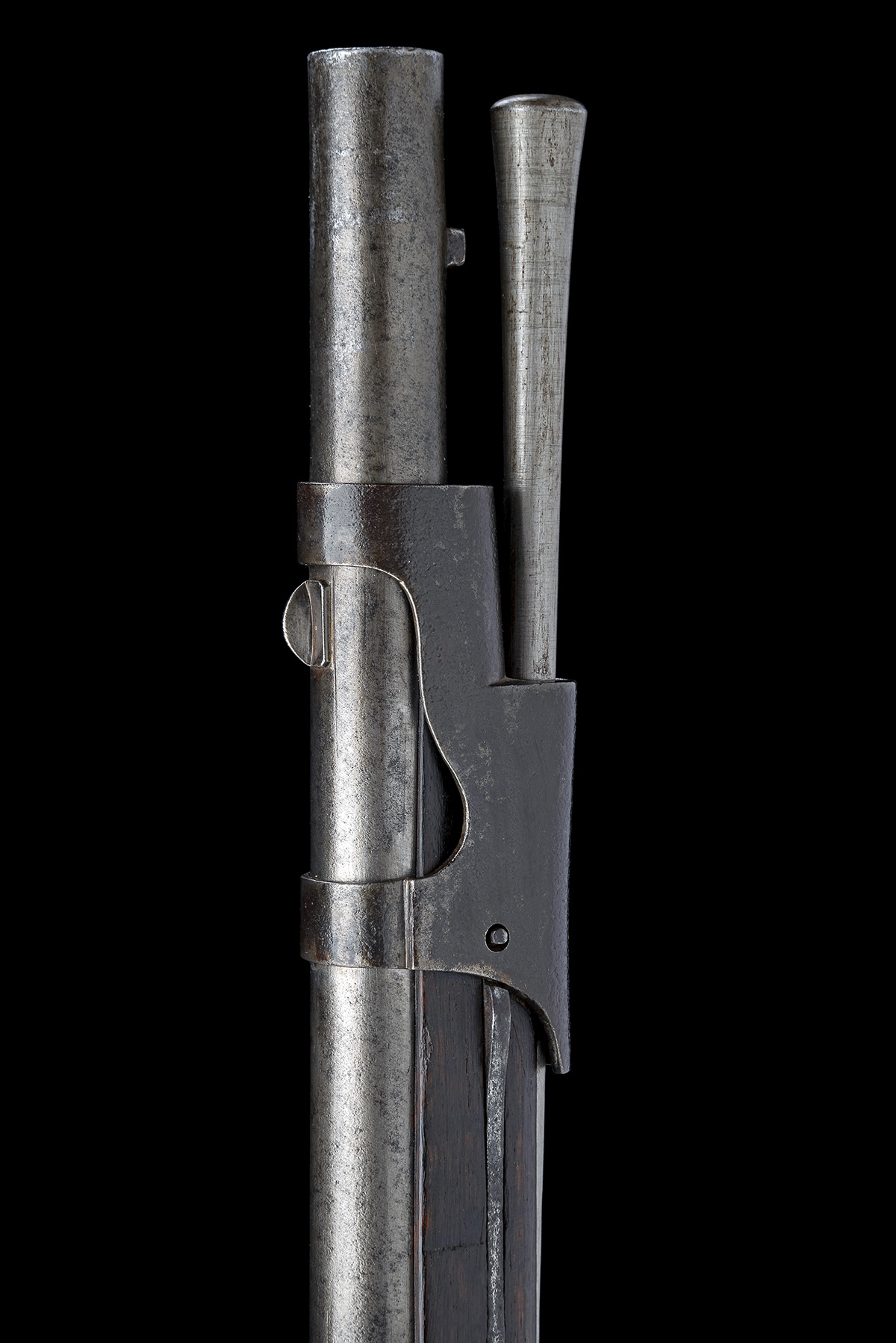with 40 1/2in. barrel with blade front-sight and fixed block vee rear-sight to tang, fitted with a small bayonet block on the underside of the muzzle, back-action lock signed 'VEY RON FILS CADET, / A ST. ETIENNE', iron mounted full walnut stock the butt stamped in an oval 'LEGIONE DI CASALE', the musket is similar to the French Pattern 1842 musket which was widely copied
