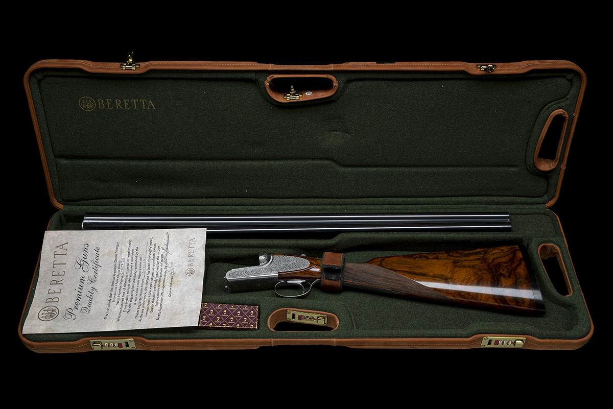 dated 2003, 28in. Excelsior high strength alloyed steel nitro monobloc barrels, 3in. chambers, bored approx. 1/4 and 1/2 choke, automatic safety with integral barrel selector switch, the action, fences and furniture engraved with floral scrollwork, the decorative sideplates engraved en suite, the underside inlaid 'GIUBILEO II' in gold, the triggerplate signed 'Bottega C. Giovanelli Inc. Bellini S', bright finish, the fore-end with ejector / non-ejector switch, 14 1/2in. figured stock including buttplate, weight 6lb. 9oz., in its makers case with some paperwork and a Stratton 'The Retainer' tie-pin, and with cardboard outer