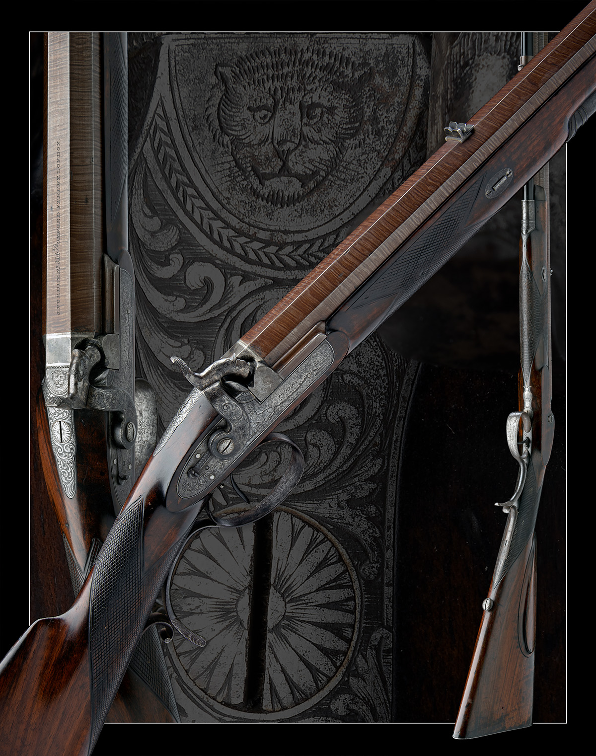completed 1831, with rebrowned octagonal 30 1/4in. barrel signed on the top-flat 'J. PURDEY, No. 314 1/2 OXFORD STREET, LONDON', bead fore-sight on white metal dove-tailed foot, rear-sight of a single folding leaf and standing notch, twin platinum lines to the angled breech, scroll engraved top-tang with a leopard's head engraved at the front, borderline and scroll engraved bar-action lock also featuring a recumbent stag and signed 'PURDEY' (some discolouration and frosting), engraved sliding safe behind the engraved dolphin headed hammer, chequered walnut half-stock with raised cheek-piece, iron furniture including chequered spur to the lower tang, single set trigger, horn fore-end tip, provision for sling and heavy duty horn-tipped ebony ramrod