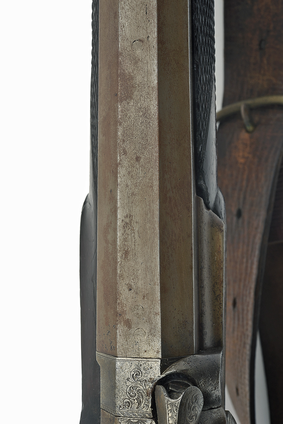circa 1860, with octagonal 33 1/4in. barrel, tunnel fore-sight, elevating ladder rear-sight, top-flat near breech drilled and plugged, squared breech, border engraved bar-action lock and hammer, the lock-bar signed 'THOMAS TURNER, 8 FISHER STREET, BIRMINGHAM', chequered walnut pistol-grip half-stock, engraved iron furniture including patchbox and replacement wood ramrod, finish lost, ramrod throat worn through, fitted with a later leather sling