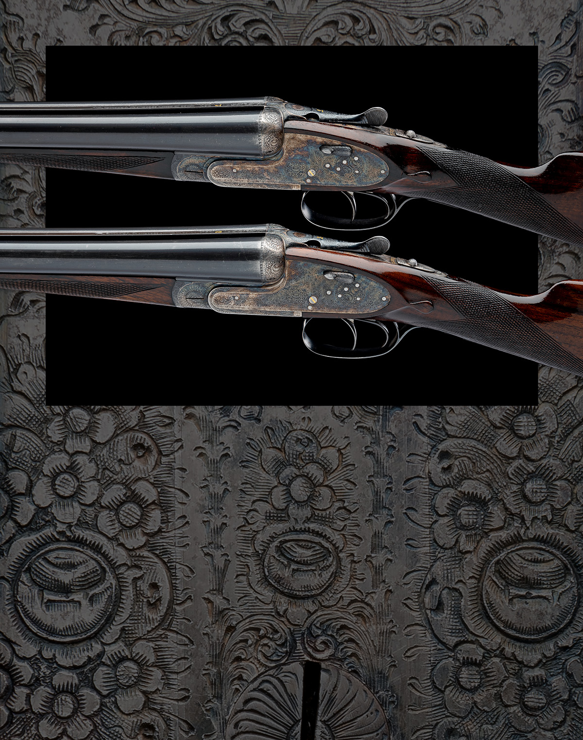 for 1972, 30in. nitro chopperlump barrels, the ribs gold-inlaid '1' and '2' at the breech ends, 2 1/2in. chambers, bored approx. imp. cyl. and 1/2 choke, toplevers gold-inlaid '1' and '2', automatic safeties, removable striker discs, hand-detachable lockplates, gold-inlaid cocking-indicators, articulated front triggers, rolled-edge triggerguards, acanthus scroll engraving with floral bouquets, retaining some original colour-hardening and finish, 15 3/8in. stocks inset with leather cheekpieces at the combs and including 3/4in. wooden extensions, setting cracks to rear of top tangs, weight 7lb. 4oz.