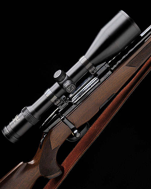 19 7/8in. nitro barrel with ramp-mounted open sights and blade foresight, the receiver mounted with a Zeiss Diavari V 3-12x56 T* telescopic sight in quickly-detachable mounts, detachable magazine, blued finish, gold-washed trigger, dial safety, stutzen pistolgrip stock with pistolgrip-cap, sculpted cheekpiece, sling swivels, 14 5/8in. pull including 3/4in. ventilated rubber recoil pad