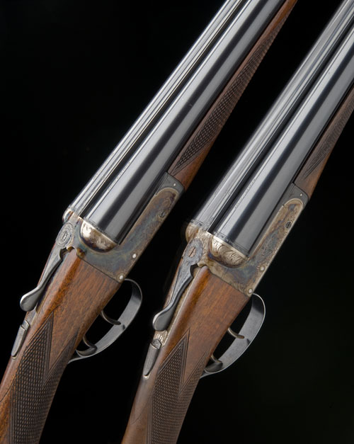 26in. nitro barrels, ribs engraved 'WEBLEY & SCOTT. BIRMINGHAM.', 2 3/4in. chambers, bored approx. imp. cyl. and 1/2 choke and 1/4 and 3/4 choke, automatic safeties, scroll-engraved actions retaining much original colour-hardening and finish, 14 3/4in. stocks, weight 6lb. 4oz., in a fleece-lined leather double gunslip