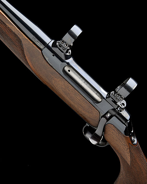 23 3/4in. unsighted nitro barrel, receiver with quickly-detachable telescopic sight mounts, detachable magazine, set trigger, sling eyes, pistolgrip stock with palm swell, 14 1/8in. pull including 3/4in. ventilated rubber recoil pad