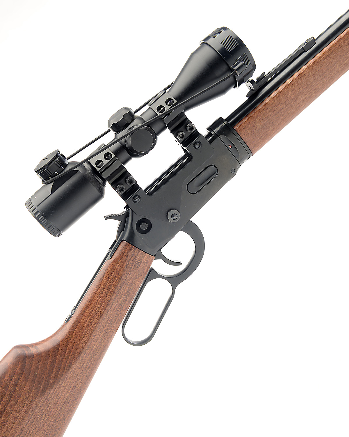 A .177 CO2-POWERED LEVER ACTION AIR-RIFLE SIGNED WALTHER, MODEL 'SHORT', serial no. W22908317, with blued and sighted 15 1/2in. barrel, blacked receiver in imitation of a Winchester 1894 rifle (magazine absent), walnut butt-stock and fore-end and dummy under-barrel magazine, appearing little used but untested, together with an unsigned 5x42 electronic telescopic sight (no battery)