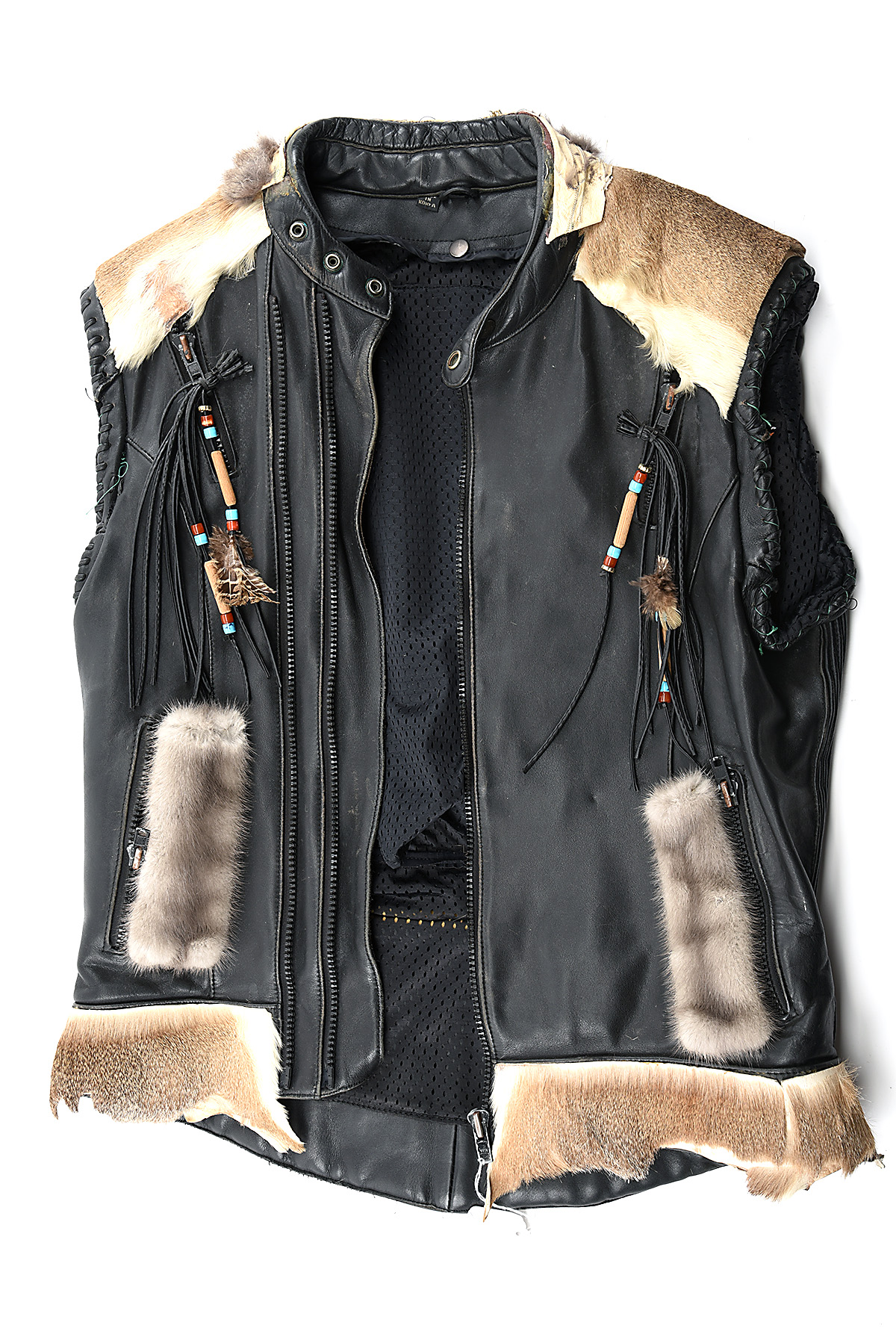 A SLEEVELESS LEATHER JACKET WITH GAME FUR SHOULDER PATCHES