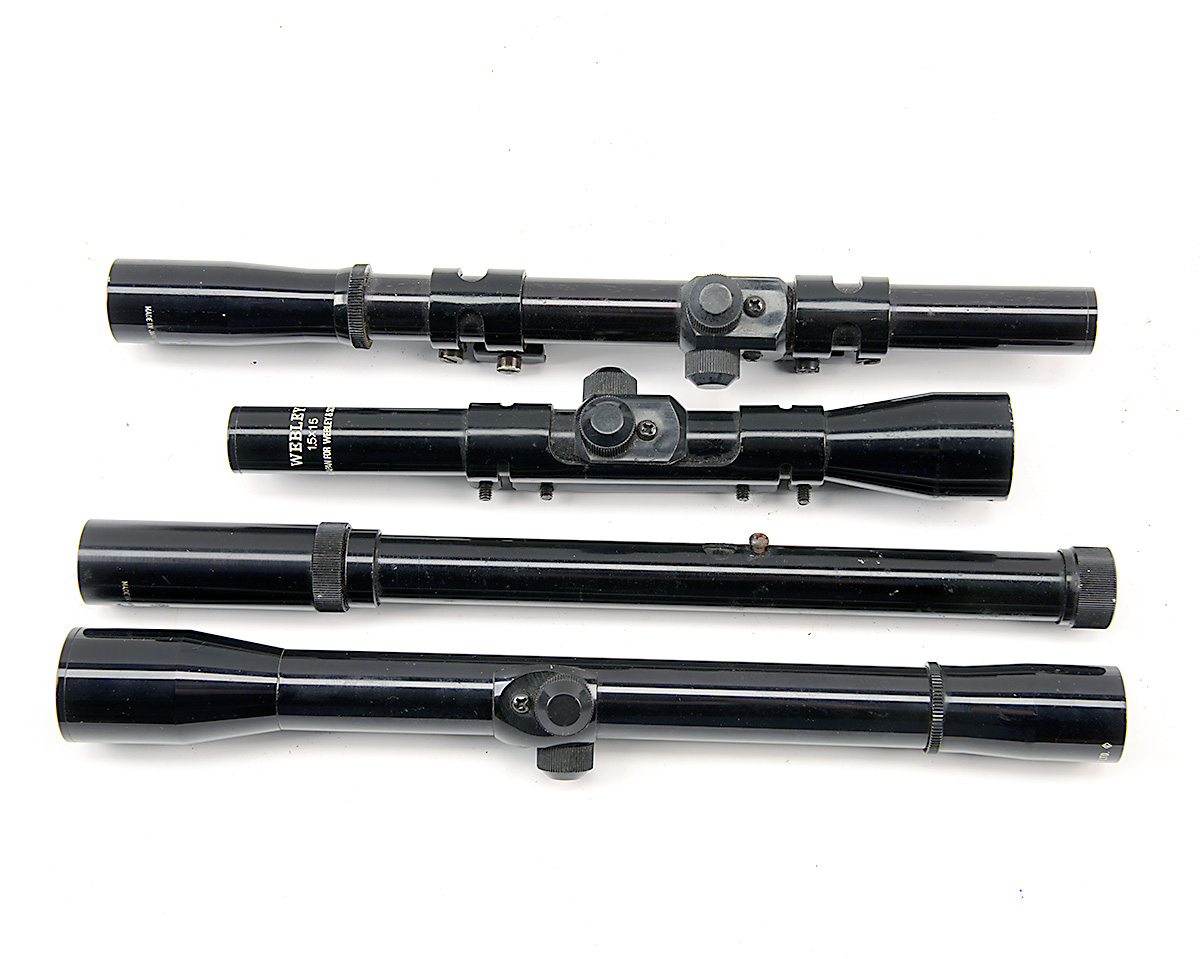 FOUR VINTAGE WEBLEY AIR-RIFLE TELESCOPIC SIGHTS TOGETHER WITH A TRIGGER ADJUSTER, including two 4x15 models, a 4x20 model and a 1.5x15 pistol-scope, the trigger adjuster from a Webley Hurricane with metal tag