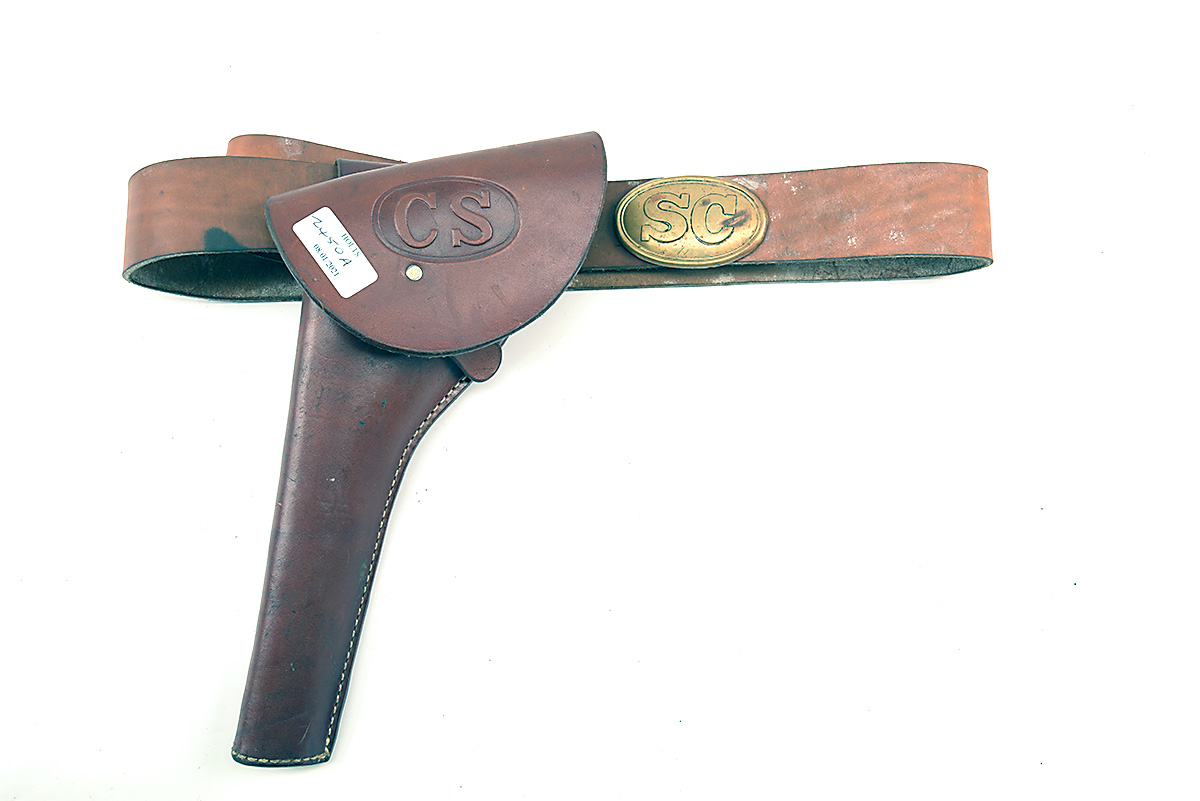 A REPRODUCTION AMERICAN CIVIL WAR CONFEDERATE STATES RIG comprising a leather belt stamped 'CS ARSENAL / RICHMOND' with a 'CS' lead-backed buckle and a 'CS' embossed revolver holster