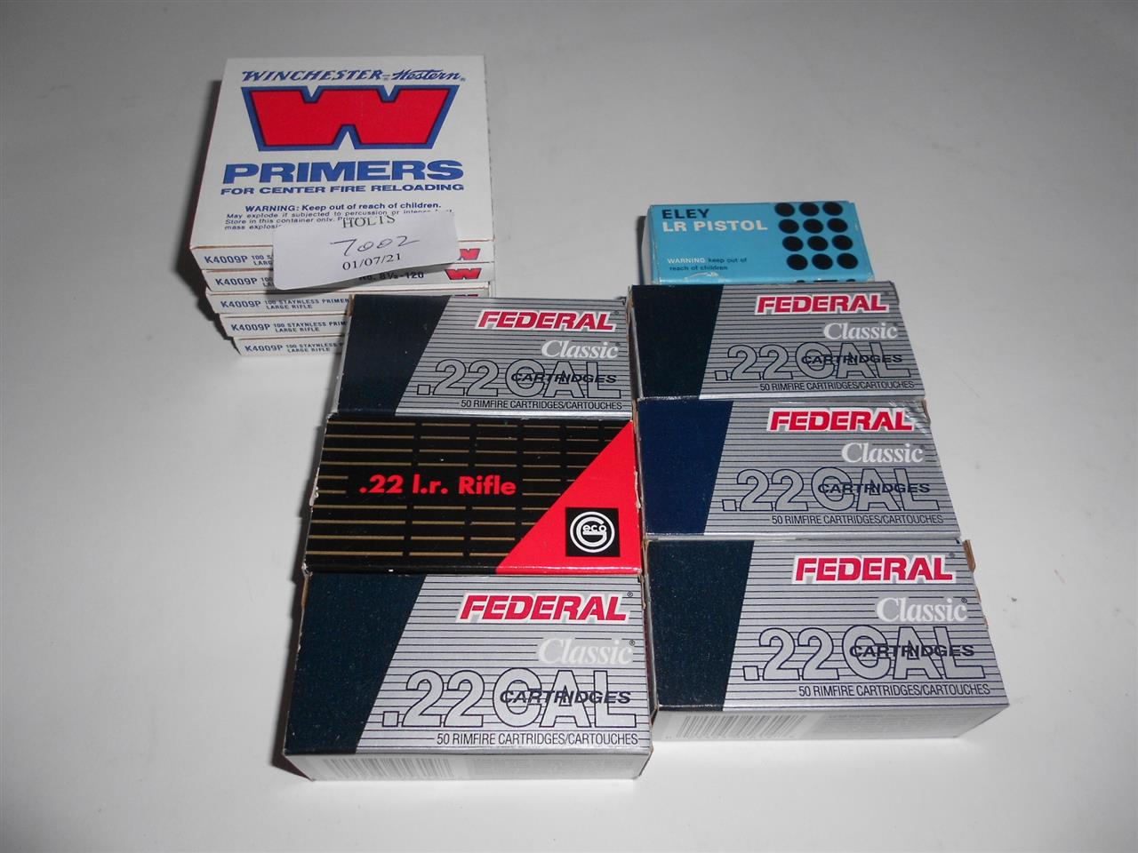 500 LARGE RIFLE PRIMERS WITH APPROXIMATELY 350 .22lr AMMUNITION comprising of 5 packets 100 Winchester large rifle primers, 250 Federal .22rf solid copper plated HV, 50 geco Match .22lr, 50 Eley LR Pistol .22lr.