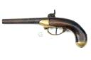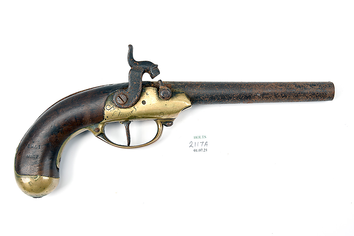 A .700 PERCUSSION SERVICE-PISTOL SIGNED 'ST ETIENNE', MODEL '1777', no visible serial number, circa 1779 with later conversion to percussion, with tapering iron 7 1/2in. barrel, brass action and walnut bag-shaped grip, some external corrosion, worn, 13 1/2in. overall