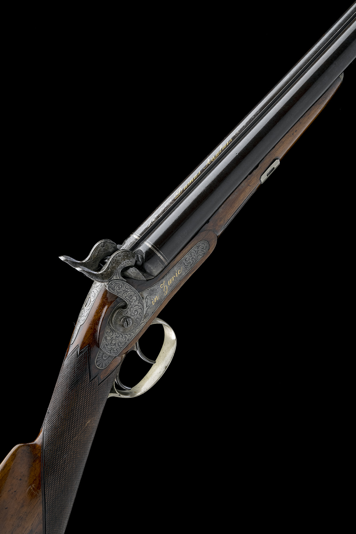 A 14-BORE PERCUSSION DOUBLE-BARRELLED SPORTING-GUN, no visible serial number,
