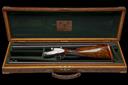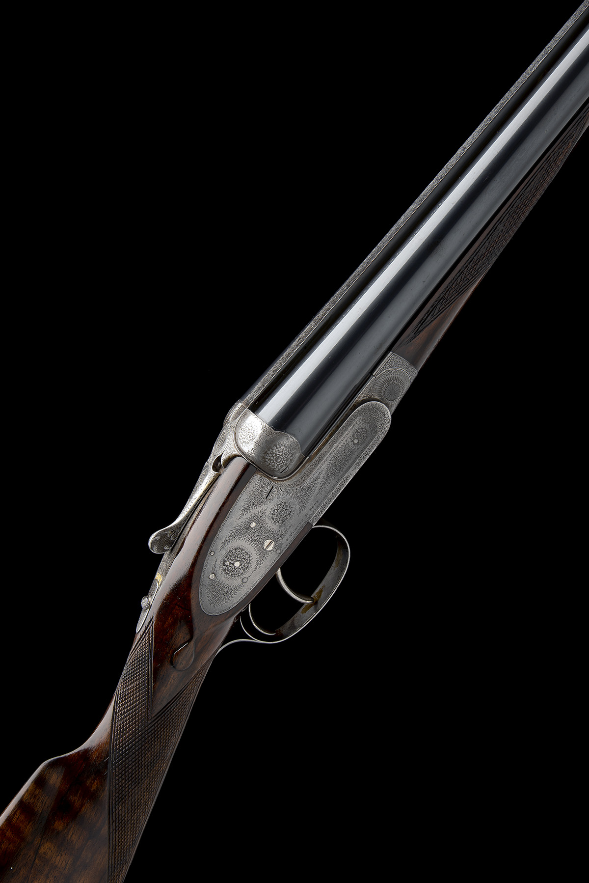 treble-grip action with hidden third bite, side-clips and removable striker discs, manual safety with gold-inlaid 'SAFE' detail, cocking-indicators, articulated front trigger, best fine acanthus scroll engraving with floral bouquets, no finish remaining, 14 3/4in. figured stock (likely historic replacement) with refreshed chequering, 3/4in. rubber recoil pad and with wood spacer, fore-end with refreshed chequering and bruising towards iron, weight 7lb. 6oz. (30in. barrels) and 7lb. 5oz. (28in. barrels), in its brass-cornered oak and leather case, with provision for both sets of barrels